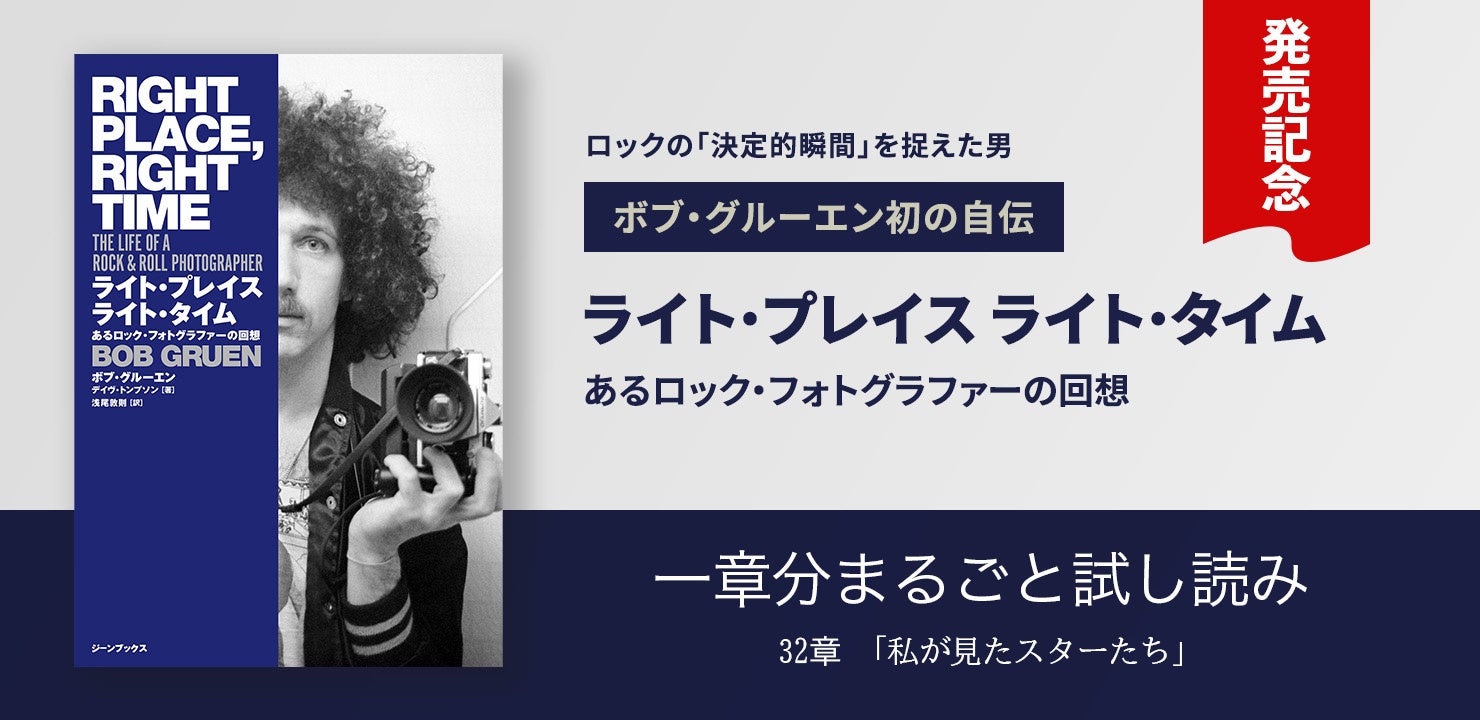 ジョン・レノン、ボブ・ディラン、ミック・ジャガー、エルトン・ジョン、セックス・ピストルズ、キッス、クラッシュ…伝説的ミュージシャンたちとともに1960年代から半世紀以上を歩んできたロックフォトグラファー、ボブ・グルーエン初の回想録『ライト・プレイス ライト・タイム あるロック・フォトグラファーの回想』が遂に日本上陸。
