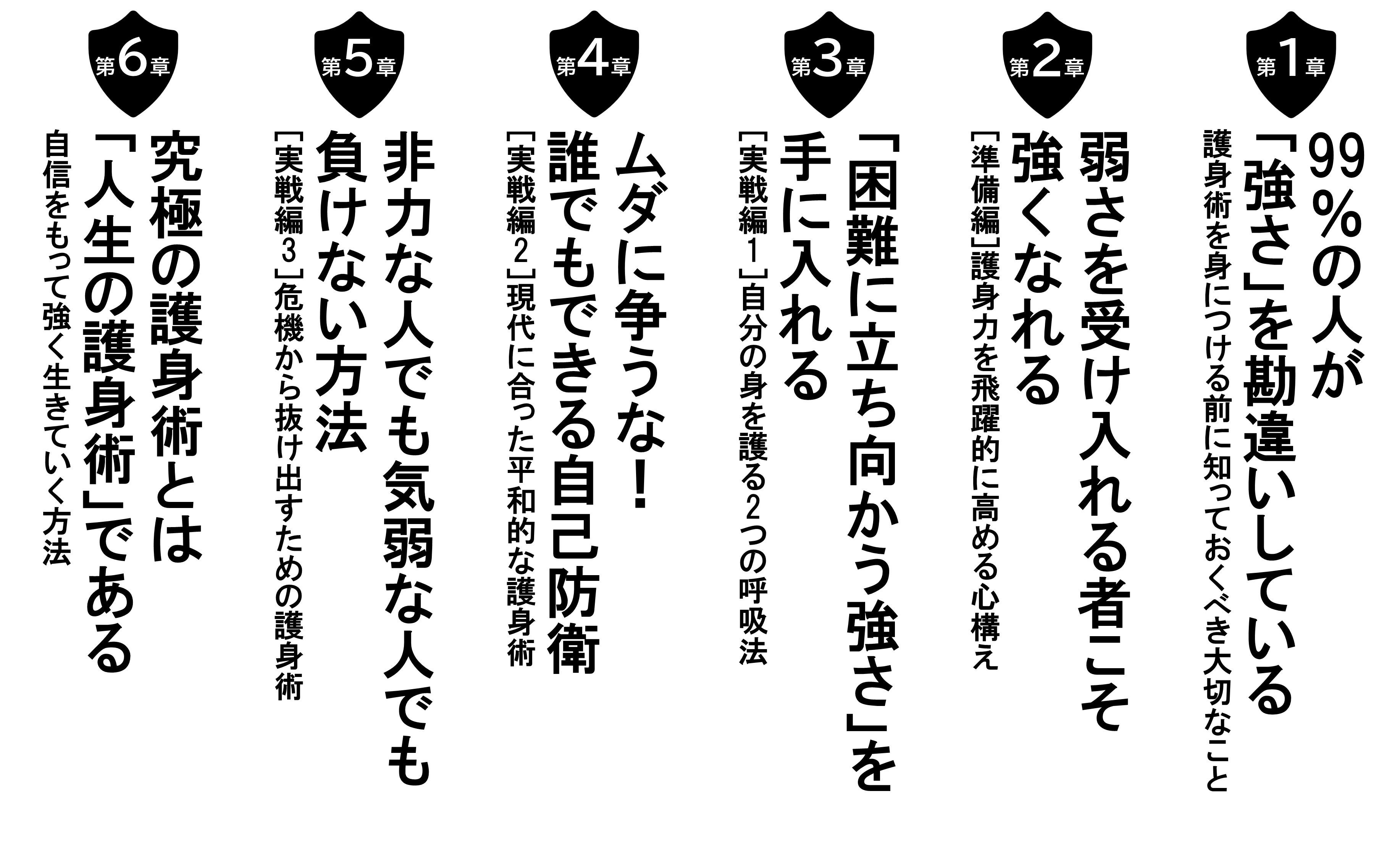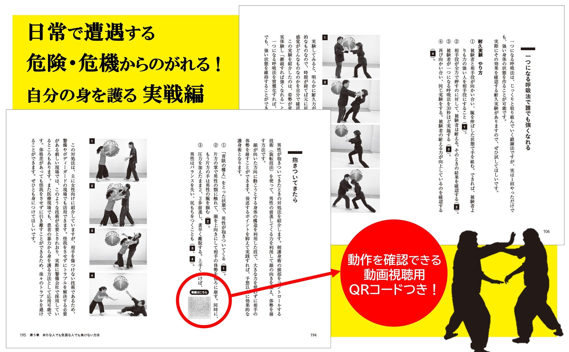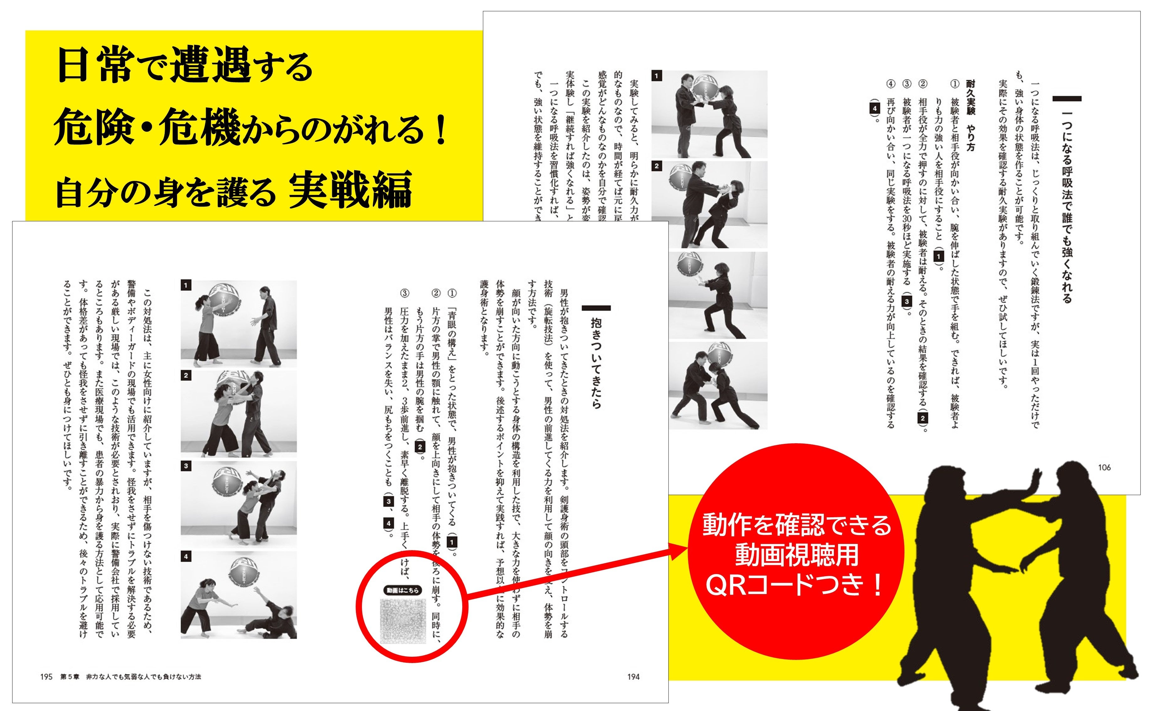 本書では、相手が襲いかかってきた場合の、具体的なさまざまなシチュエーションを想定。写真と解説をつけ、呼吸法から護身術までわかりやすく紹介します。