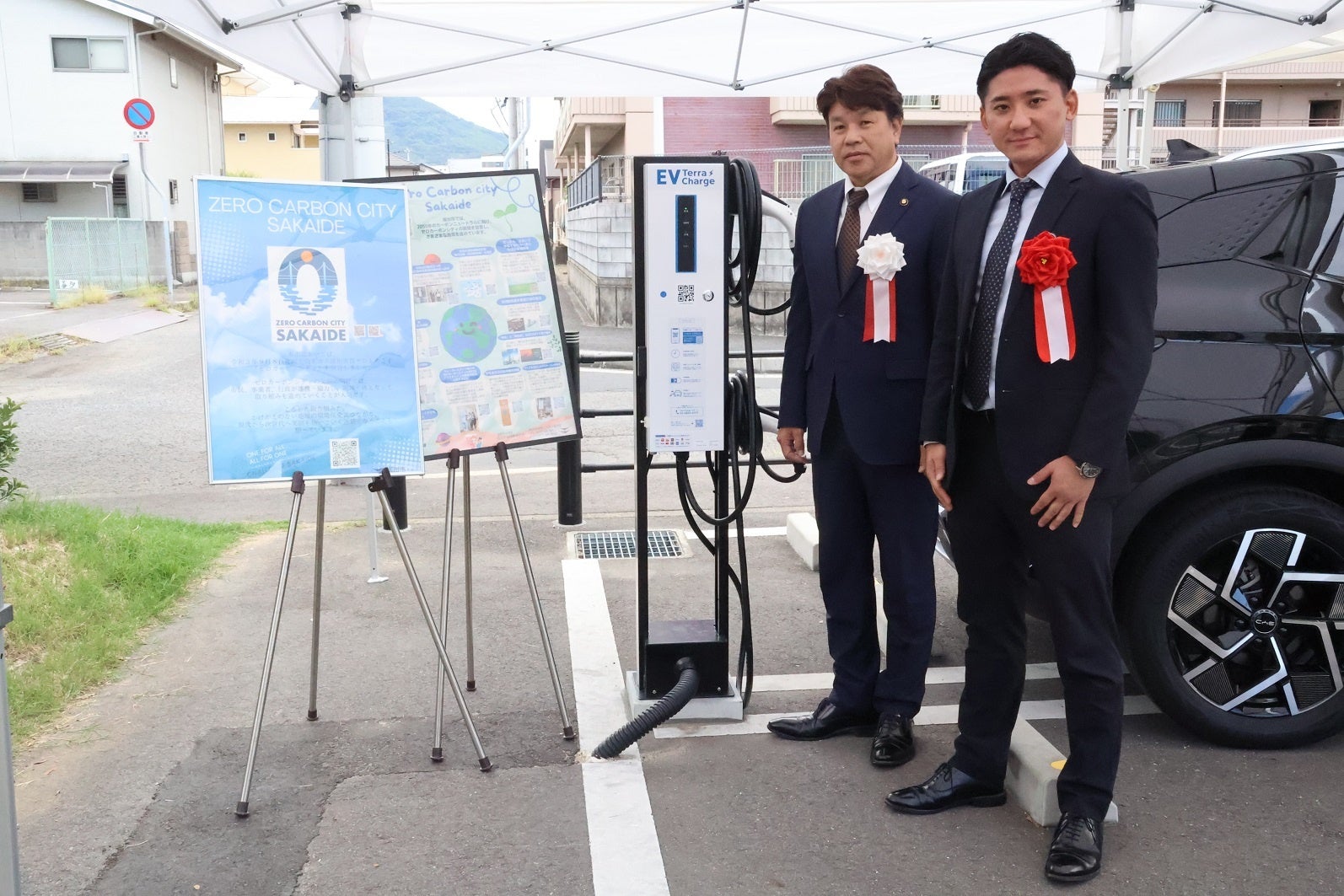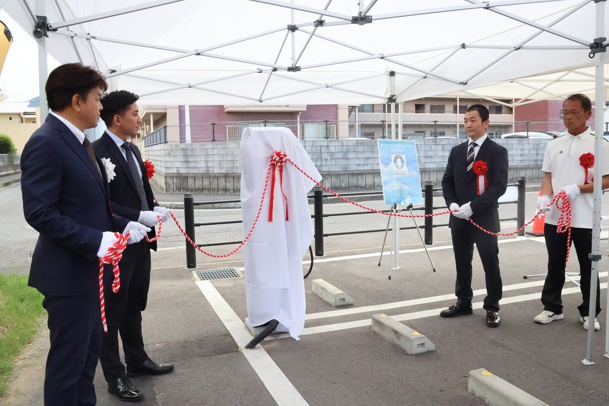 設置を記念し、市長による充電デモンストレーションや除幕によるEV充電器のお披露目を実施いたしました