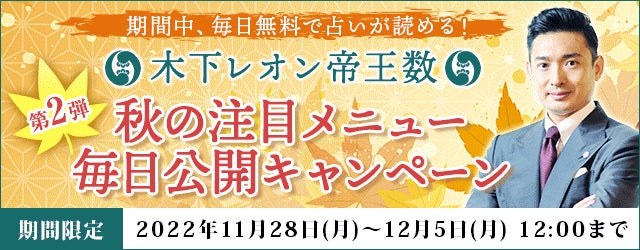 大人気占い師・木下レオンの月額公式サイト『木下レオン◆帝王数』にて、『秋の注目メニュー毎日公開キャンペーン第2弾』を開催中!