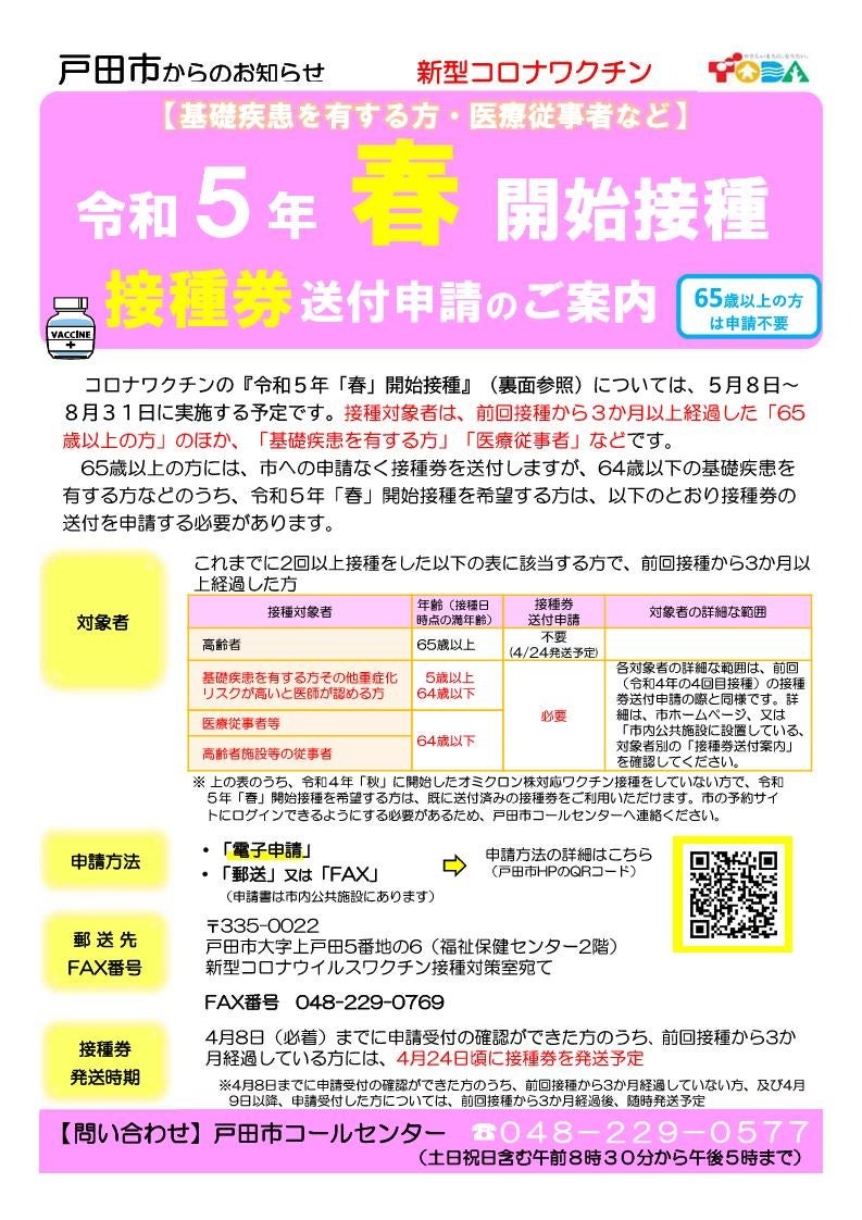 ※令和5年「春」開始接種の「接種券送付申請のご案内(別添チラシ)」について、「全戸配布」を行うこととし、4月1日(土)から市内各家庭への配布を開始するほか、基礎疾患を有する方等の対象者別の「接種券送付申請案内・申請書」を市内公共施設に配架します。