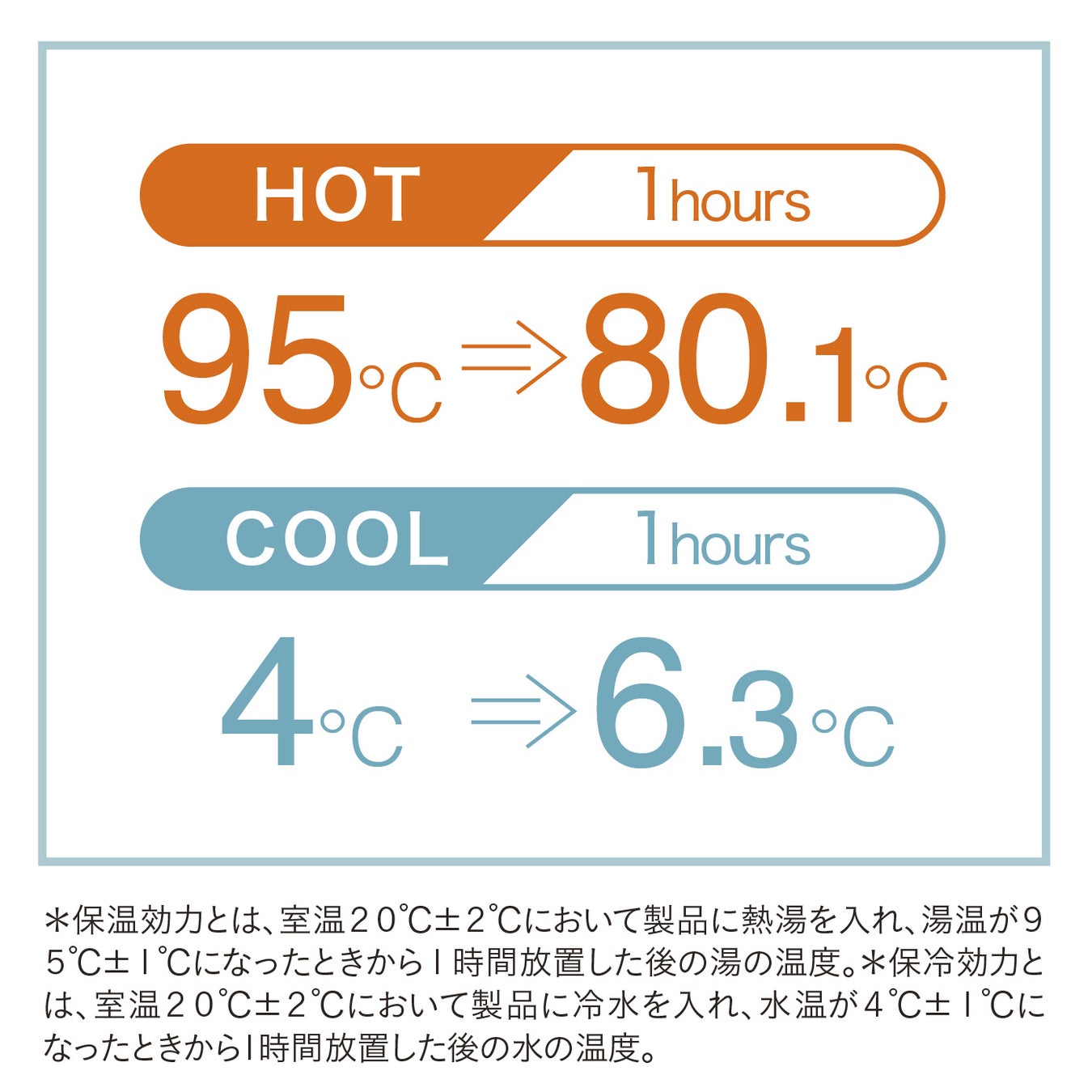 温かい飲み物は1時間後でも約80℃をキープ。冷たい飲み物も1時間後でしっかり冷たさを保ちます(※室温20℃前後の場合)。