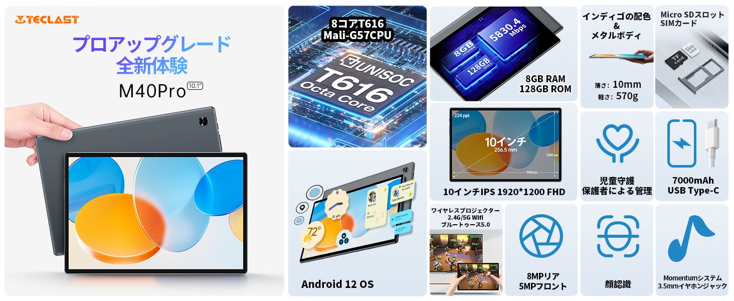 Teclast「M40 Pro」は、UNISOC Tiger T616プロセスを使用しております。2つのArm Cortex-A75ハイパワーコアと6つのCortex-A55インテリジェントAIコアを搭載して、発熱を抑えながら優れた性能を維持します。また、Unisoc T616は、UFS2.1ストレージでの読み取りと記録の高速化もサポートしているため、アプリケーションをインストールしてゲームをすばやくロードできます。