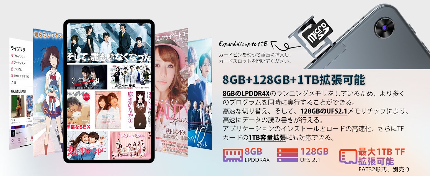 デュアルSIM /Micro SDスロットとTD-LTEおよびFDD-LTE 4Gネットワークのサポートにより、仕事と生活を自由に切り替えることができます。8GBのRAMと128GBのストレージで、スムーズな体験を提供できて、さらに多いストレージを実現するMicro SDカードの拡張もサポートするので、マルチタスクとファイルの保存を心配することなくお楽しみください。