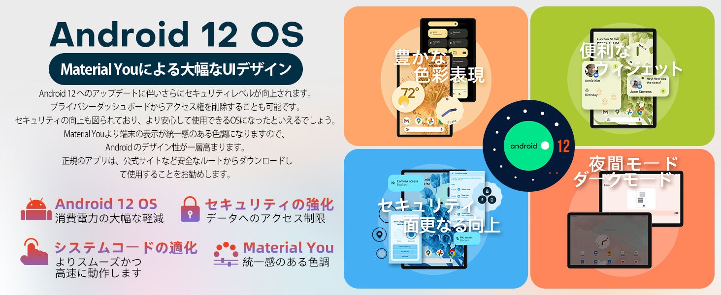 Android 12を搭載して、よりパーソナライズで安全かつ簡易なシステムエクスペリエンスを提供します。ユーザーはUIの配色やウィジェットなどを自由にカスタマイズすることができるだけでなく、クリックやスワイプ、スクロールもよりスムーズに行えるようになります。また、GPSにも対応しています。GLONASSとGalileo三大衛星測位システムにより、精確度のより高い位置情報が提供されます。