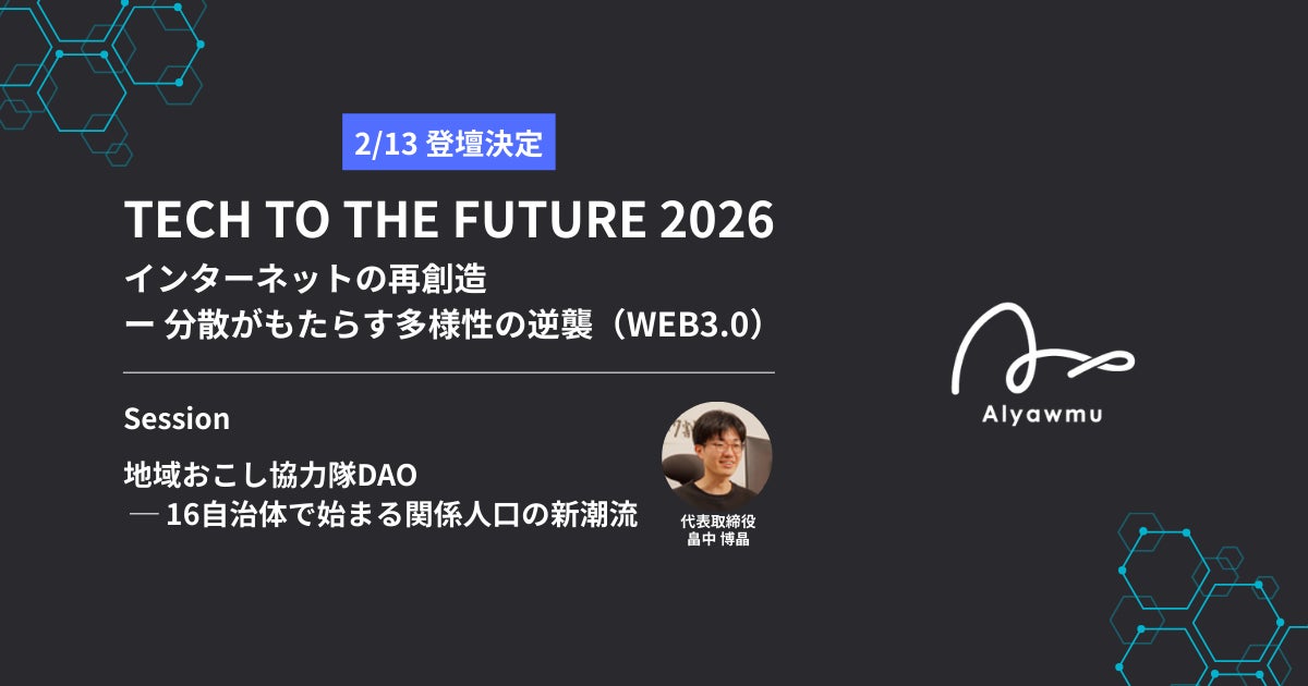 DAOやNFTを活用した地方創生に取り組む株式会社あるやうむ(本社:札幌市、代表取締役:畠中博晶)は、2026年2月13日(金)に開催されるWEB3.0イベント、TECH TO THE FUTURE 2026 Day5「インターネットの再創造 ― 分散がもたらす多様性の逆襲(WEB3.0)」に登壇することをお知らせします。