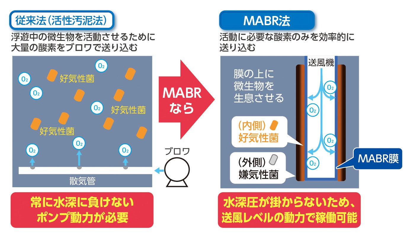 膜を介して酸素を供給する生物膜法の新技術で、低駆動圧力で効率的な水処理を実現する環境貢献型水処理方法です。