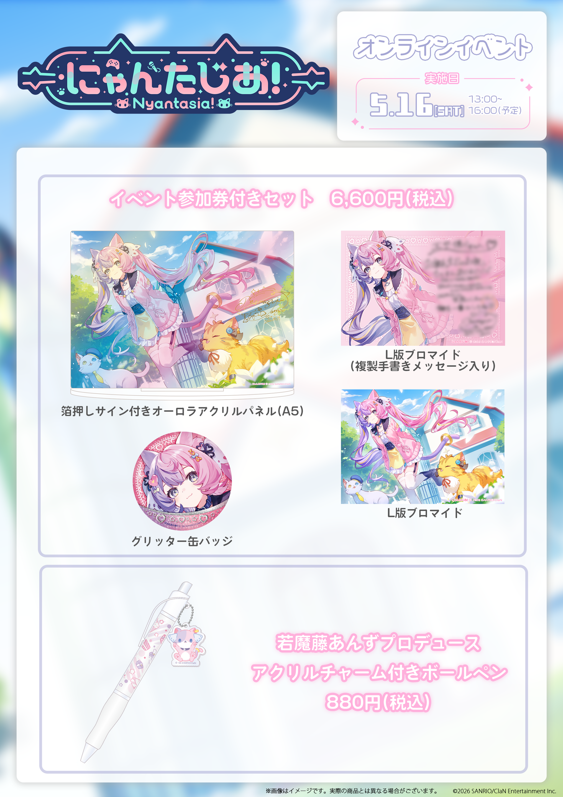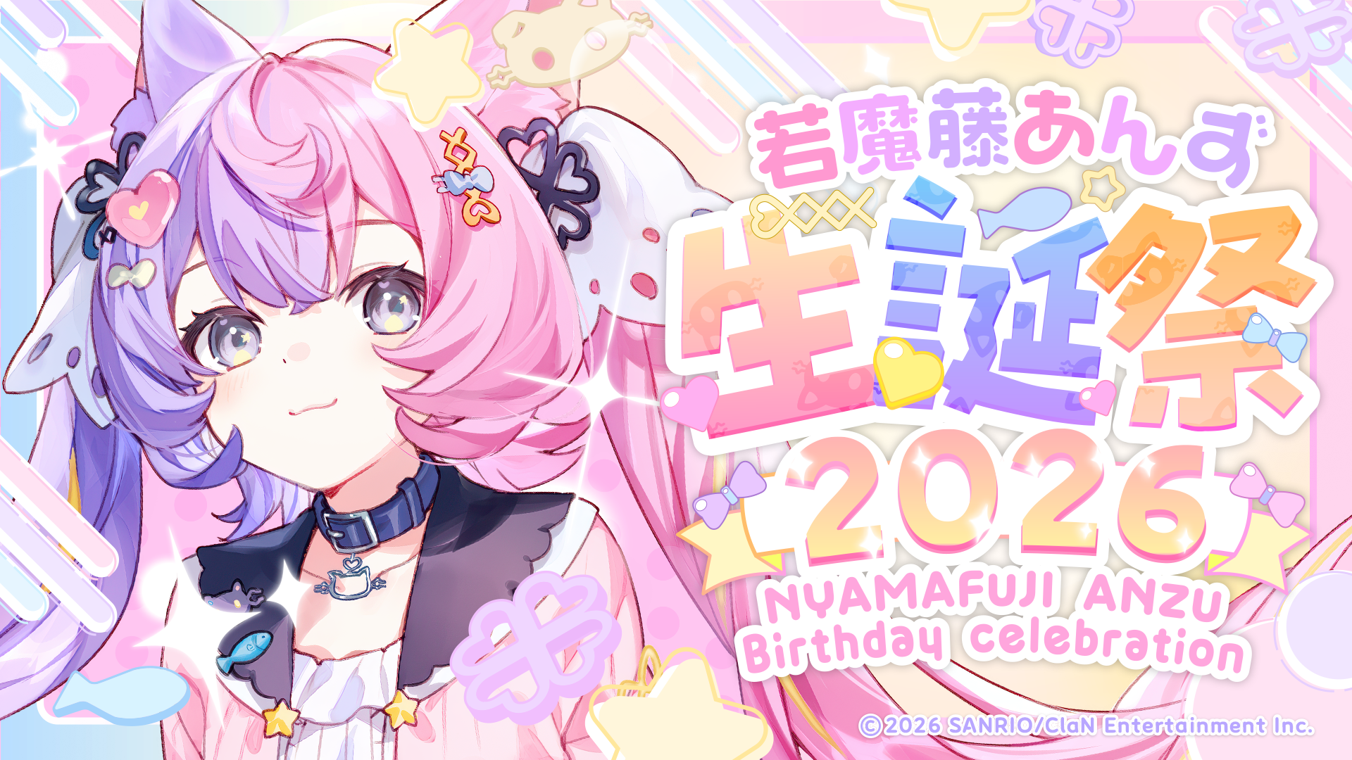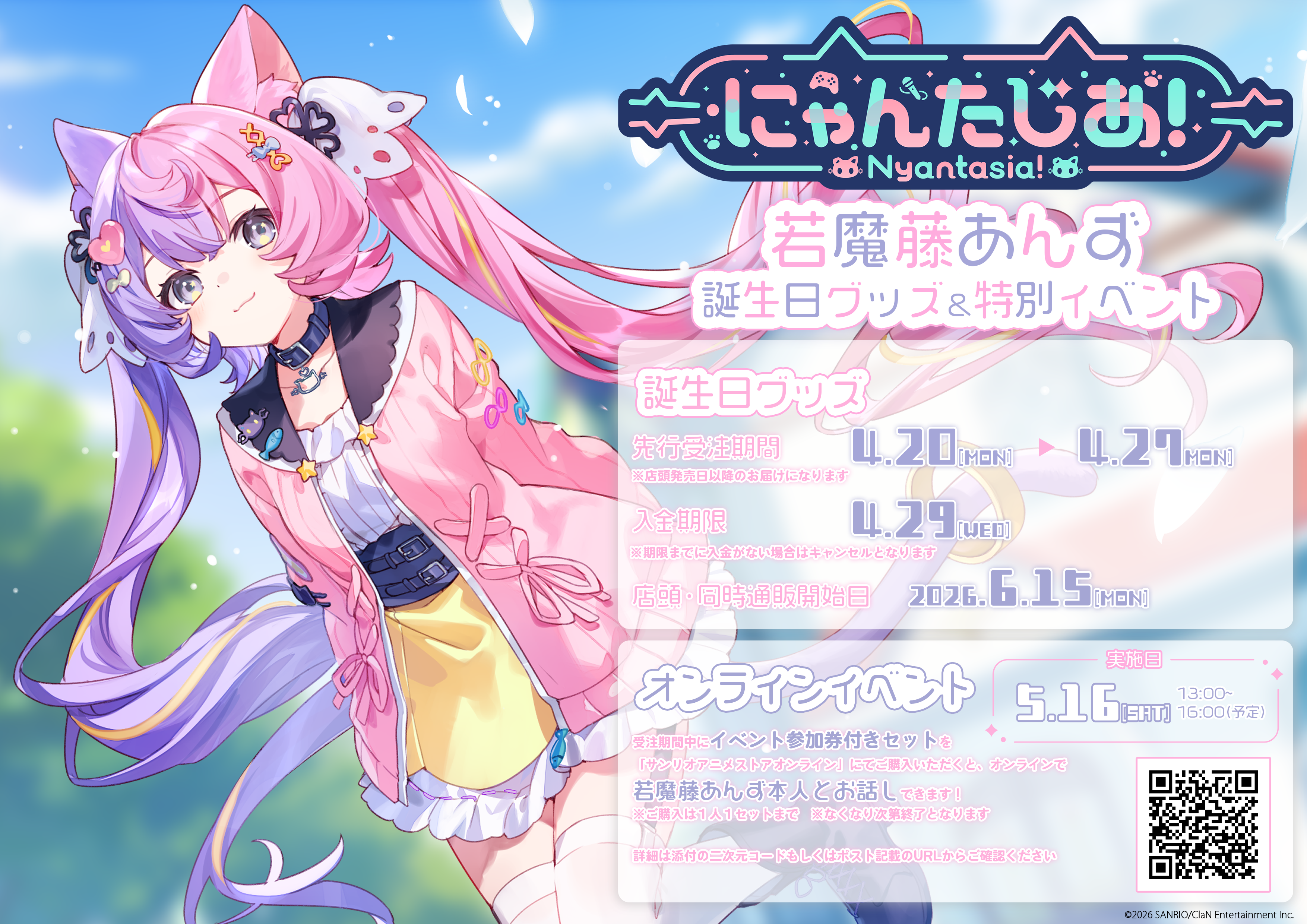 株式会社ClaN Entertainment(本社:東京都港区 代表取締役社⻑:⼤井 基⾏、以下ClaN)は、株式会社サンリオ(本社:東京都品川区)と共同で行うVTuberプロジェクト「にゃんたじあ!」に所属する「若魔藤あんず」が4月19日に誕生日を迎えたことを記念し、誕生日グッズの販売を行います。