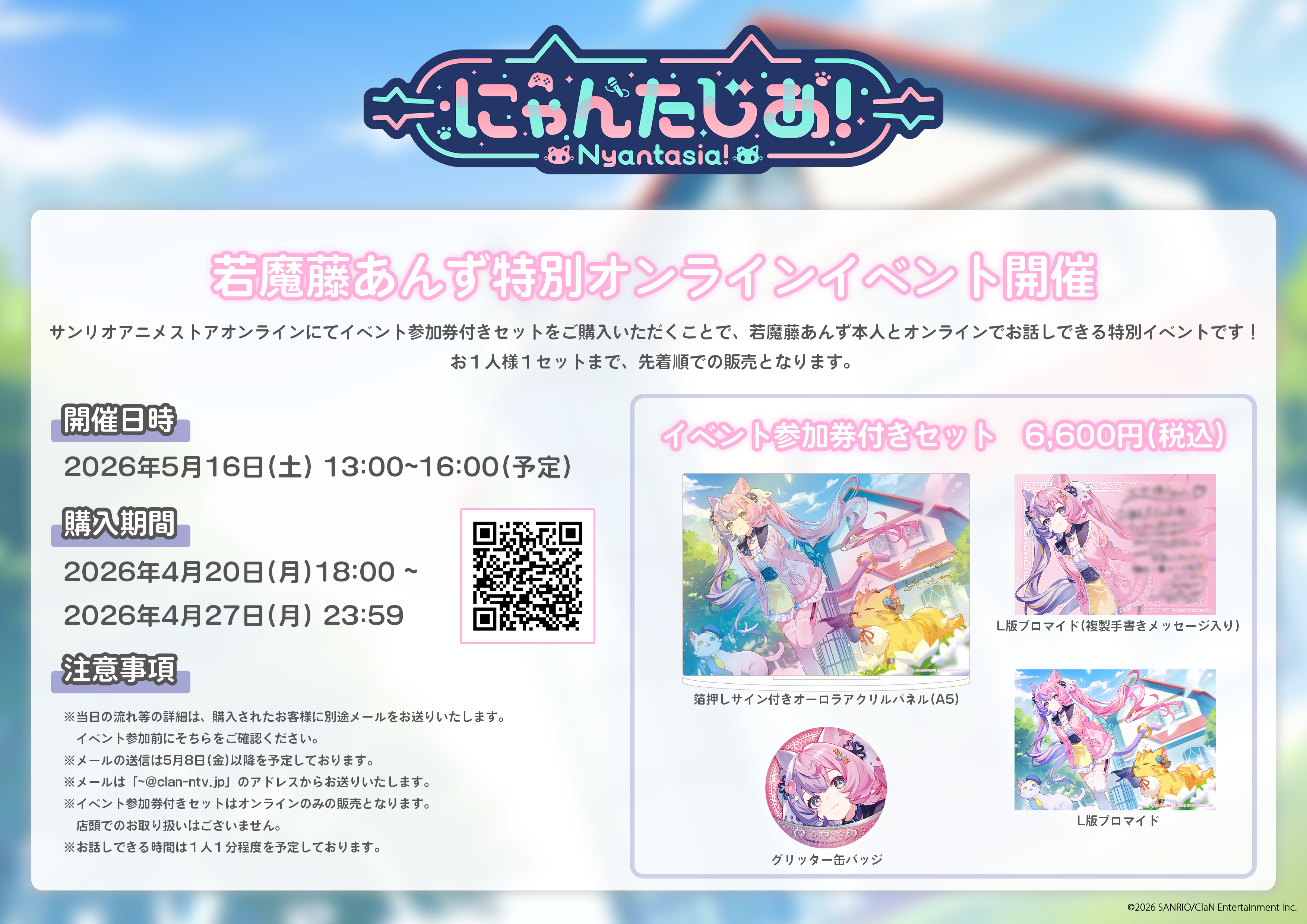 2026年4月20日18:00〜2026年4月27日23:59までの先行受注期間中に通販サイト「サンリオアニメストアONLINE」でイベント参加券付き生誕グッズセットをご購入いただいた方には、2026年5月16日(土)13:00〜15:00にオンラインで開催予定の特別イベントへご参加いただけます。