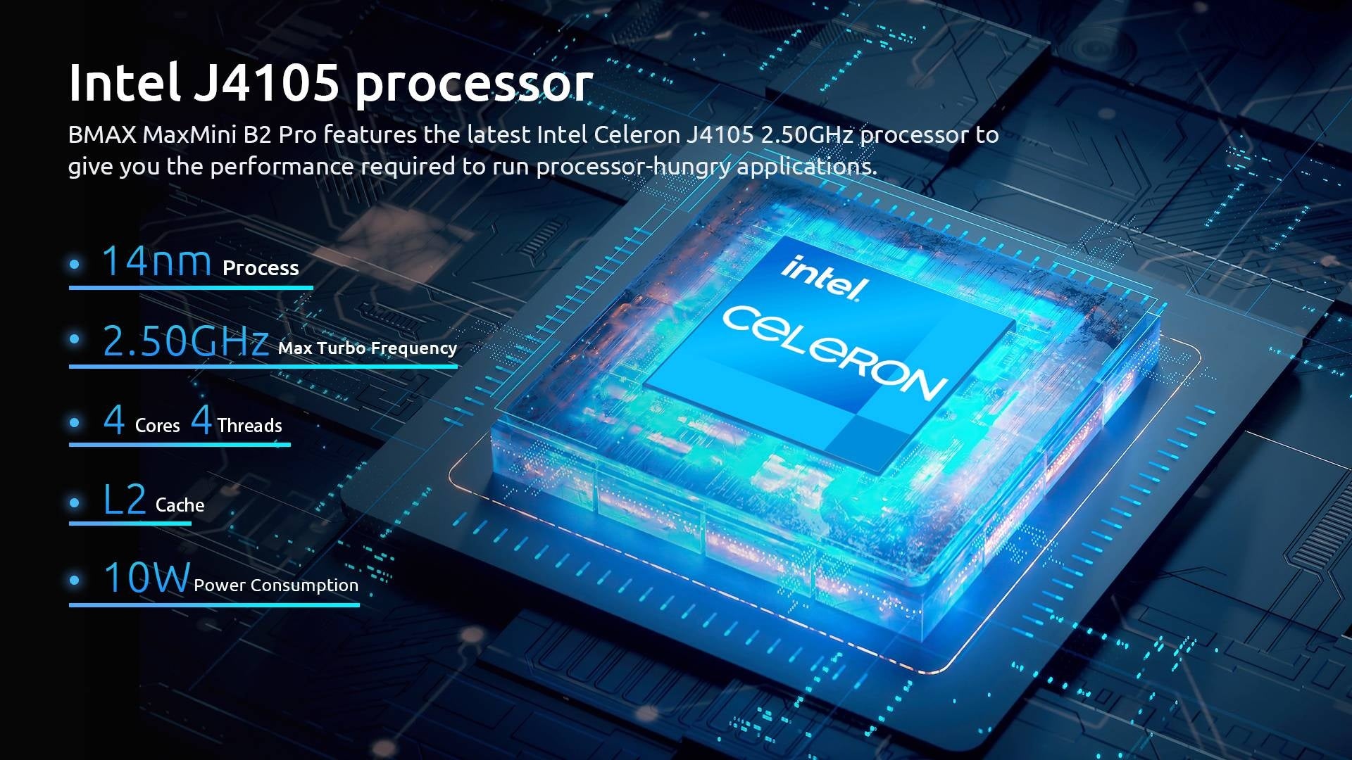 B2 ProはCeleron J4105 プロセッサ(4コア4スレッド)を搭載し、Win11 Proがプリインストールされたシステム。バースト周波数1.5GHz〜2.5GHz、驚異的な応答性を提供し、事務処理、web閲覧、ビデオ会議、動画編集、 Youtubeからの4K@60Hzビデオの再生とNetflixは常にスムーズで、うまく機能します。