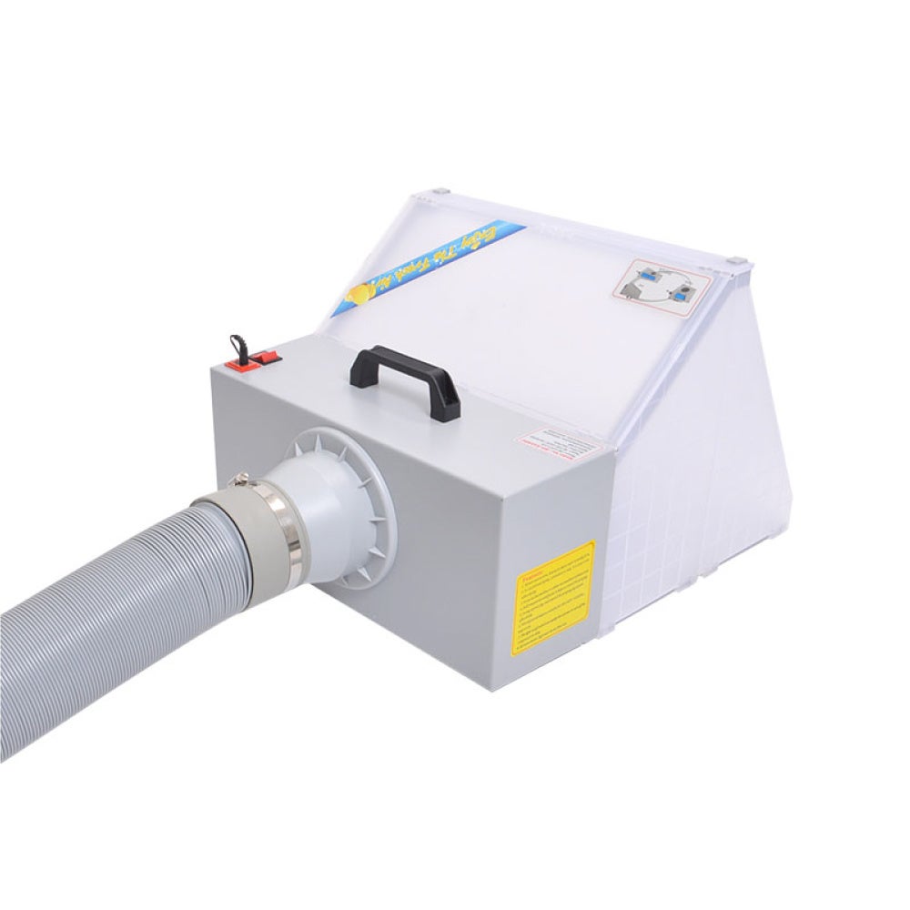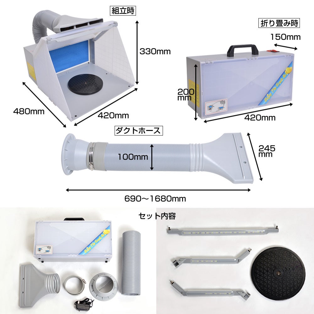本製品は、塗料のニオイを吸って外に出す、LEDライト付きで作業がしやすいコンパクト塗装ブースです。