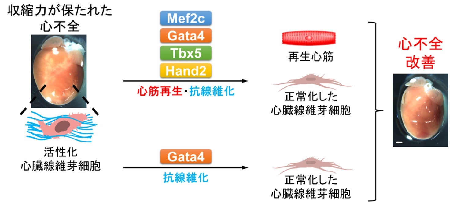 心臓を構成する心筋細胞は再生能力が乏しく、心機能が著しく低下した心不全の根治療法は、心臓移植しかありませんが、ドナー不足などの問題により、十分な治療の提供は困難です。また、iPS細胞などの多能性幹細胞を用いた再生医療が注目されていますが、これにも、腫瘍形成の可能性、組織生着率や治療効果の低さに加えて、心不全の特徴である心臓線維化への治療効果が乏しいといった課題があります。本研究グループは、これらの課題を解決し得る方法として、多能性幹細胞を用いずに心臓線維芽細胞から直接心筋細胞を誘導する「心筋ダイレクトリプログラミング法」を開発し、心筋梗塞マウス、収縮力が低下した心不全マウスにおける心臓再生と、心臓線維化と心臓機能の改善に成功しています。心不全は収縮力が低下した心不全と、収縮力の保たれた心不全に二分されますが、これまで、有効な治療法のない収縮力の保たれた心不全にもこの方法が適用できるかは不明でした。そこで本研究では、心臓線維芽細胞において心筋リプログラミング遺伝子の発現を薬剤投与によって自由に制御できる遺伝子改変マウスを開発し、このマウスを用いて、心筋ダイレクトリプログラミングにより、収縮力の保たれた心不全の線維芽細胞から心筋細胞が再生し、心臓線維化と心臓機能が改善することを世界で初めて明らかにしました。さらに、心筋リプログラミング遺伝子の一つであるGata4遺伝子が心臓線維化治療に重要であることを発見し、Gata4遺伝子単独の遺伝子導入による、心臓線維化改善効果を介した収縮力の保たれた心不全の治療法を開発しました。