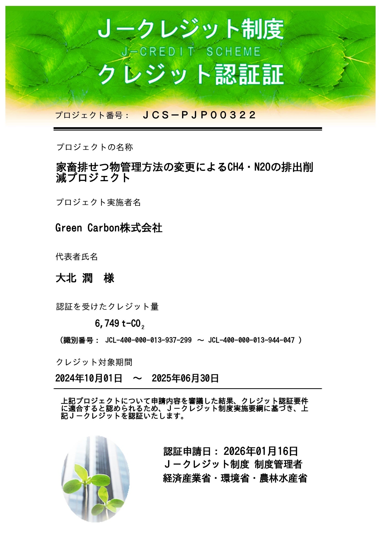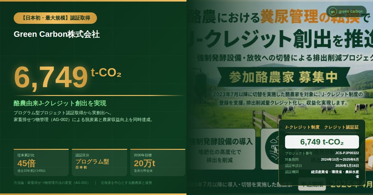 ネイチャーベースのカーボンクレジット創出・販売事業を展開するGreen Carbon株式会社(代表取締役:大北潤、以下「Green Carbon」)は、北海道を中心とする酪農家と連携し、家畜排せつ物の管理方法変更(AG-002)に基づくJ-クレジット創出プロジェクト(以下「本プロジェクト」)において、同方法論における国内最大規模となる6,749t-CO2のクレジット創出を実現しました。