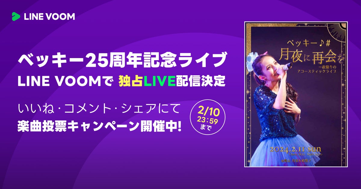 LINEヤフー株式会社は、「LINE」アプリ内の動画プラットフォーム「LINE VOOM」にて、ベッキー♪♯の6年ぶりとなるライブ『月夜に再会を ~一夜限りのアコースティックライブ~』を、2024年2月11日(日)に「LINE VOOM」で独占無料ライブ配信します。また、「LINE VOOM」上での投票で当日歌唱する楽曲を決めるスペシャルキャンペーンを2024年2月5日(月)より開催します。