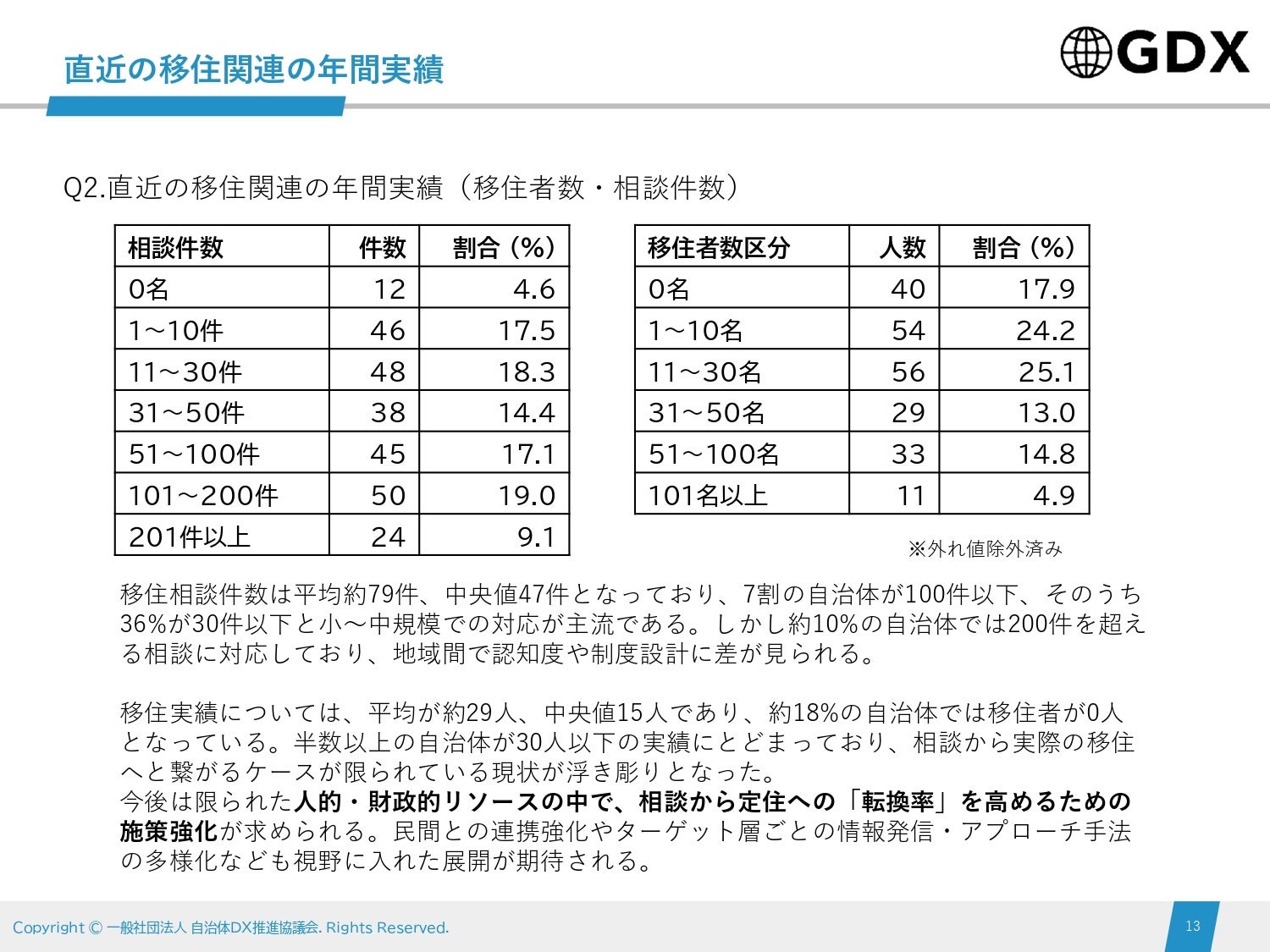 GDXが全国343自治体を対象に実施した調査(2025年1月〜2月実施)に基づき、年間の移住相談件数(中央値47件)に対し、実際の移住者数(中央値15人)が少ない現状を報告。限られたリソースの中で、いかに相談から移住に繋げるかという「転換率」を高めることの重要性を強調しました。