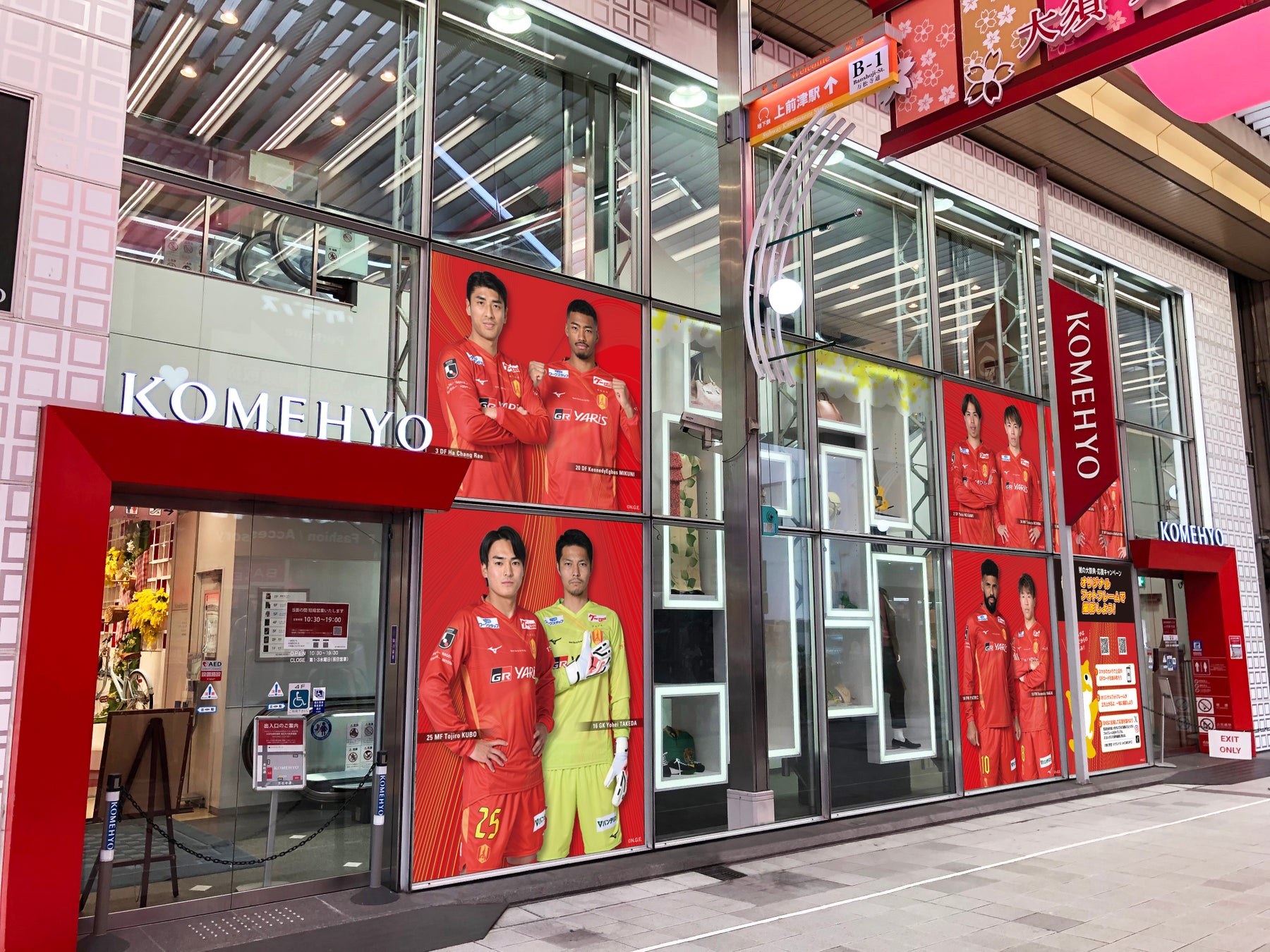 KOMEHYOは、名古屋グランパスのパートナー企業として、以前から名古屋グランパス、大須商店街と三位一体となって地域を盛り上げる取り組みをしてきました。今年も「鯱の大祭典2024」開催のタイミングで、来店される方にはもちろん、商店街に来られる方が楽しめるよう、KOMEHYO名古屋本店本館にQRコードの仕掛け付きの特別ラッピングにいたします。