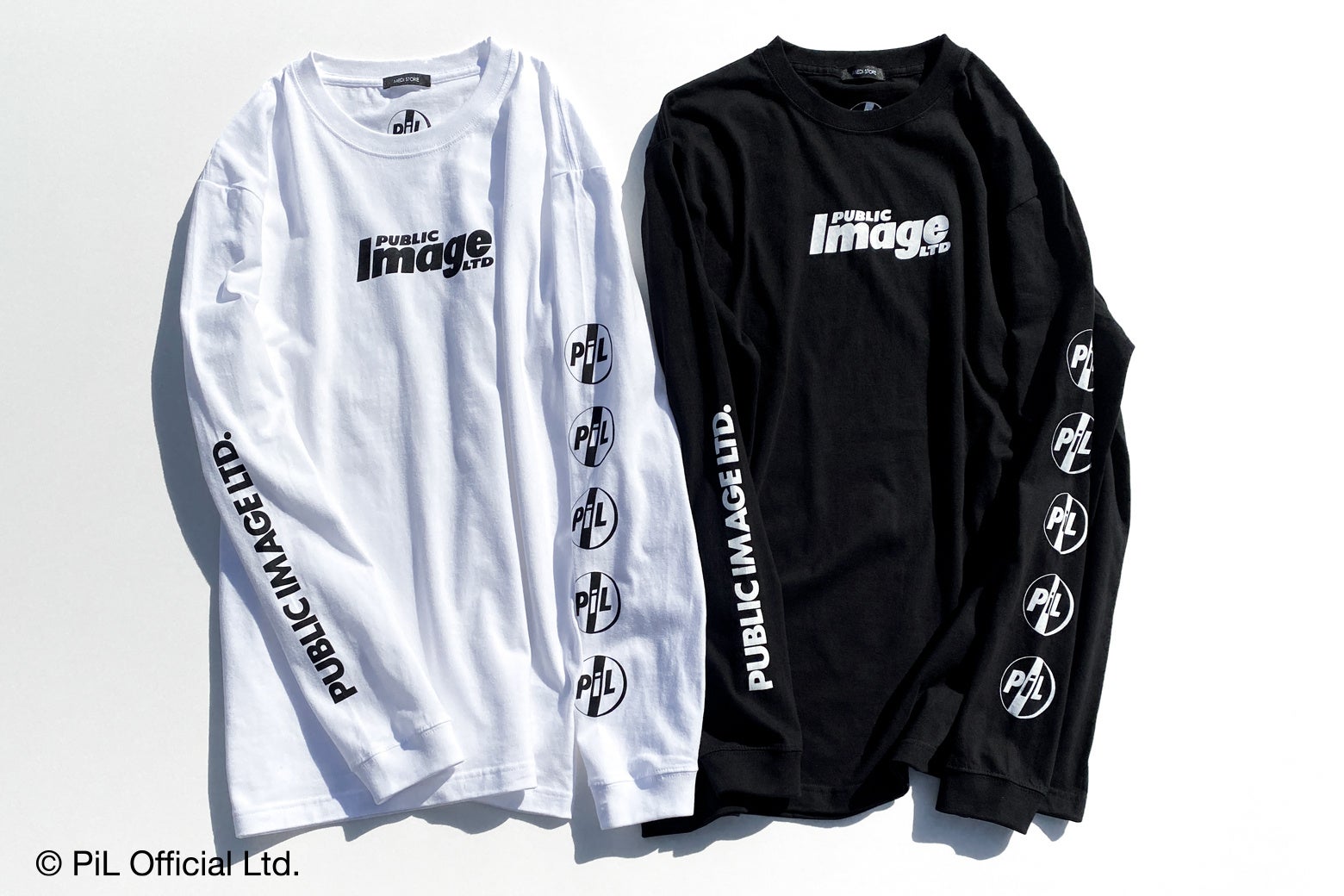 右袖に「PUBLIC IMAGE LTD」を、左袖にバンドを象徴するロゴを並べたシンプルかつ印象的なデザインに。