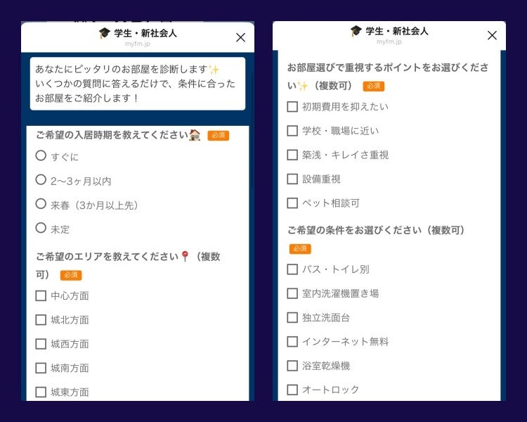 質問はすべてチェック形式のため、入力ストレスなく、希望条件を短時間で送信できます。