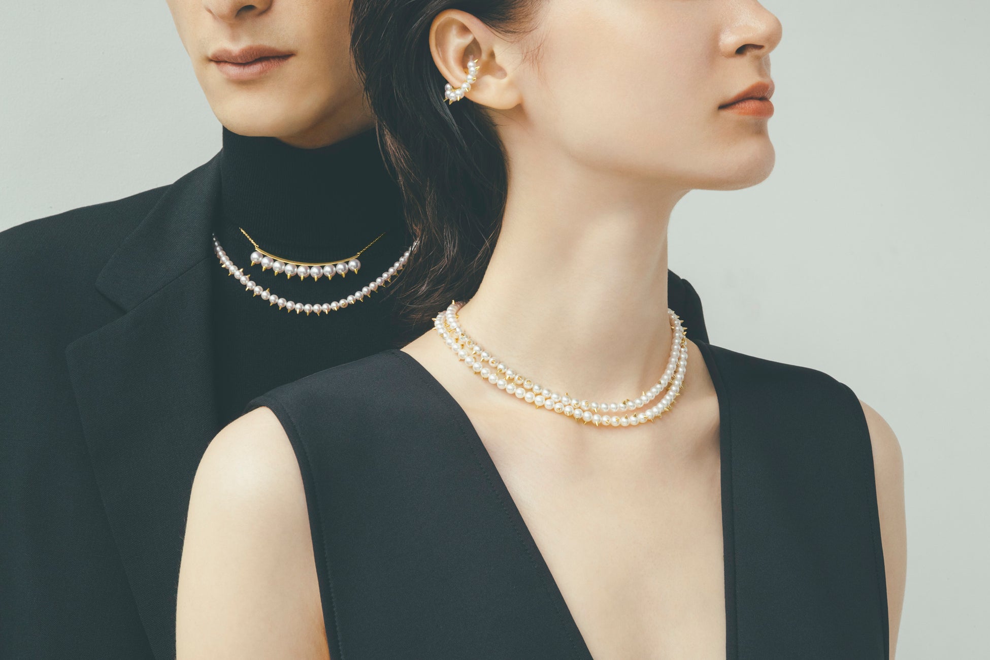 デインジャー トライブ イヤーカフ(片耳用) [18K イエローゴールド、あこや真珠] ¥242,000、デインジャー ネックレス (ロングを2連にして着用) [18K イエローゴールド、あこや真珠] ¥1,540,000、