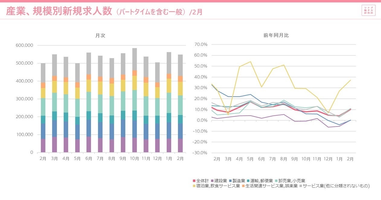 新規求人数は、前年同月比+10.4%と前月(+4.2%)の伸びを超えました。伸び率トップ3は宿泊業,飲食サービス業(+37.2%)、教育,学習支援業(+23.7%)、卸売業,小売業 (+11.1%)となりました。一方で農,林,漁業(-6.8%)と金融業,保険業(-2.0%)のみ、伸び率が前年同月を下回っています。