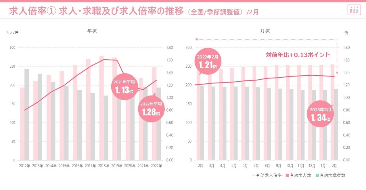 2023年2月度の有効求人倍率は1.34倍。完全失業率は2.6%/労働市場データレポート(2023年2月度版)