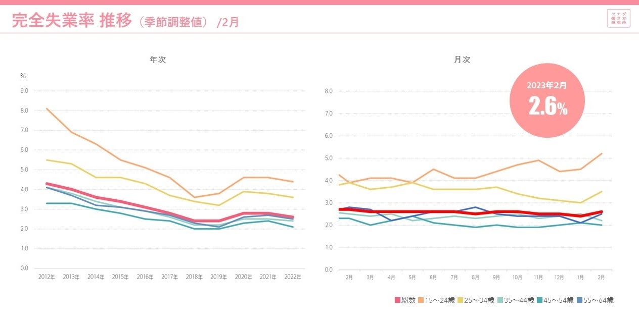 多様な働き方の調査研究機関「ツナグ働き方研究所(拠点:東京都千代田区/所長:平賀充記)」は、官公庁などが発表する労働市場関連のデータをキュレーションしつつ、分かりやすくまとめた「労働市場データレポート」を毎月発表していきます。今回は3月下旬に発表された最新データをもとに2023年2月度レポートについて、とりまとめましたのでご報告いたします。