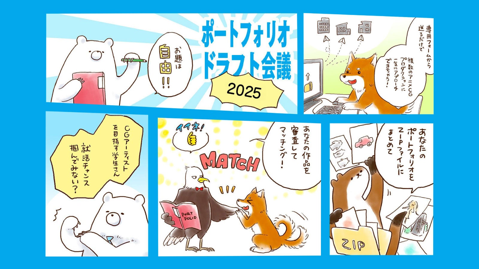 ポートフォリオドラフト会議は、CGアーティスト(モデラー・リガー・アニメーターなど)を目指す学生が、ポートフォリオを提出することで、複数のアニメ制作CGプロダクションに一括で就活アプローチできるWEB就活企画です。アニメ制作技術に関する総合イベント「あにつく」の関連企画として毎年開催しています。