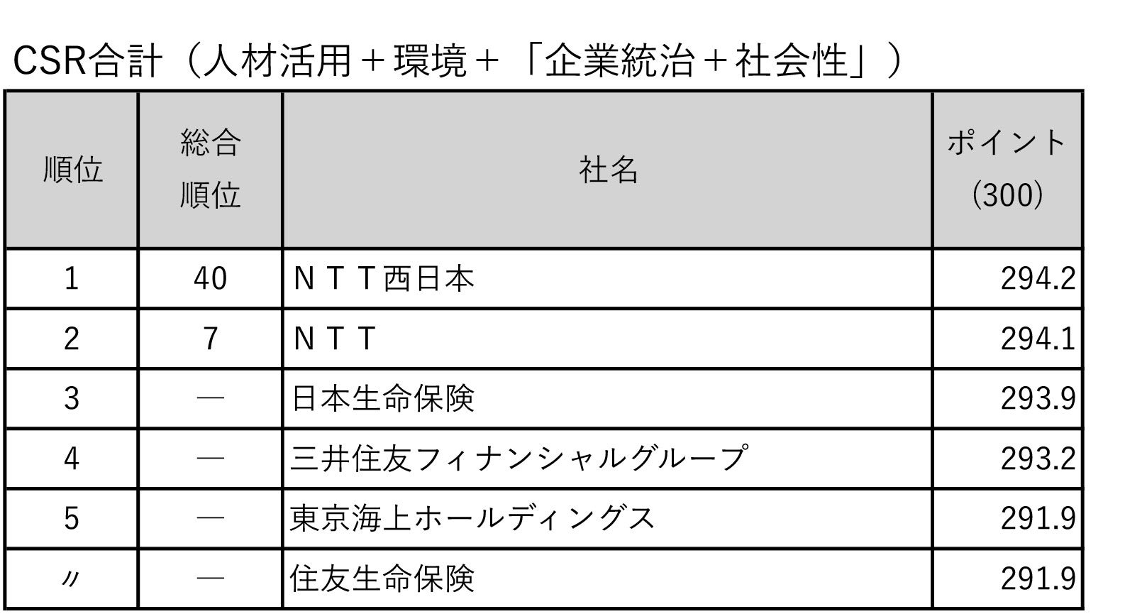 東洋経済新報社「財務・企業評価チーム」が作成。対象は『CSR企業総覧(雇用・人材活用編)(ESG編)』2026年版掲載の1656社(上場1578社、未上場78社)。調査は2025年6~10月に実施。CSR分野の「人材活用」(100点満点)、「環境」(同)、「企業統治+社会性」(「企業統治」と「社会性」の合計で100点満点)の3つ(計300点満点)に、「財務」(収益性、安全性、規模、各100点。計300点満点)を加え、総合ポイント600点満点で評価。「財務」以外の項目は基本的にアンケート内容を基に評価している。ただし、一部アンケート未回答でも公開情報のみで評価を行っている企業もある。評価は原則として加点方式で行い、回答内容による減点はない。「人材活用」「環境」「企業統治+社会性」の得点はトップ企業を100点に調整。「財務」は多変量解析の主成分分析手法を用い、収益性、安全性、規模の3つの分野で評価している。