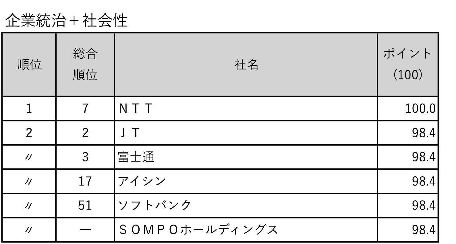 2位はJTです。人材活用68位、環境24位、企業統治+社会性2位、財務12位といずれも上位を堅持し、3年連続の2位となりました。役員報酬にGHG排出量ネットゼロやDE&IなどのESG指標を採用しています。NPOと連携して社員の健康増進と途上国支援を組み合わせた活動を行うほか、葉タバコ農家の支援も継続し、2011年から累計約28.7万世帯の収入向上に寄与しています。