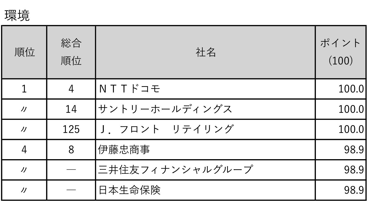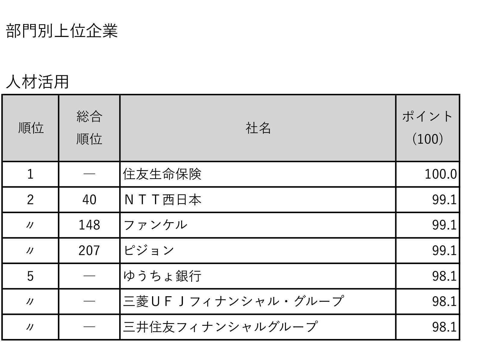 金融機関ランキングは三井住友フィナンシャルグループが4年連続の1位となりました。部門別でも人材活用5位、環境4位、企業統治+社会性24位と高水準です。同社は従業員エンゲージメント調査を毎月実施し、結果を部署単位で迅速に還元しています。1人当たりの年間教育研修費用・時間もそれぞれ10万円、25.5時間とトップクラスです。環境面では、脱炭素に取り組むための「トランジションファイナンス」に関するエンゲージメントを積極的に実施しています。
