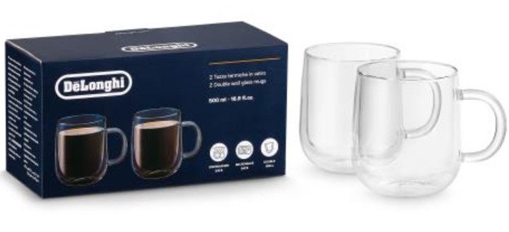 今回発売する、デロンギ ダブルウォールグラス マグカップ 2個セット(DLSC327)は、デロンギでも長年ご好評いただいているダブルウォールグラスに取っ手が付いて、よりお使いいただきやすくなりました。 ガラスを二重構造にすることで空気が断熱効果を生み、保冷・保温の効果と結露のしにくい優れた機能性に。今まで以上に多様な場面やコーヒースタイルにお応えできます。また、500mLと大容量なので、氷を入れたアイスコーヒーや冷たいドリンクに最適です。