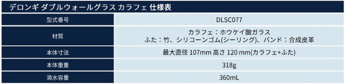 同時発売2点目のデロンギ ダブルウォールグラス カラフェ(DLSC077)は、注ぎ口の形状に工夫が施されており、カラフェから他の容器への移し替えも簡単。製品上部のレザー調のバンドや竹製のふたなど、スタイリッシュな見た目が特長で、コーヒーベースのアレンジメニューでも便利にお使いいただけます。専用のふたで保温効果をより長続きさせ、ふたをしたまま冷蔵庫での保存も可能です。