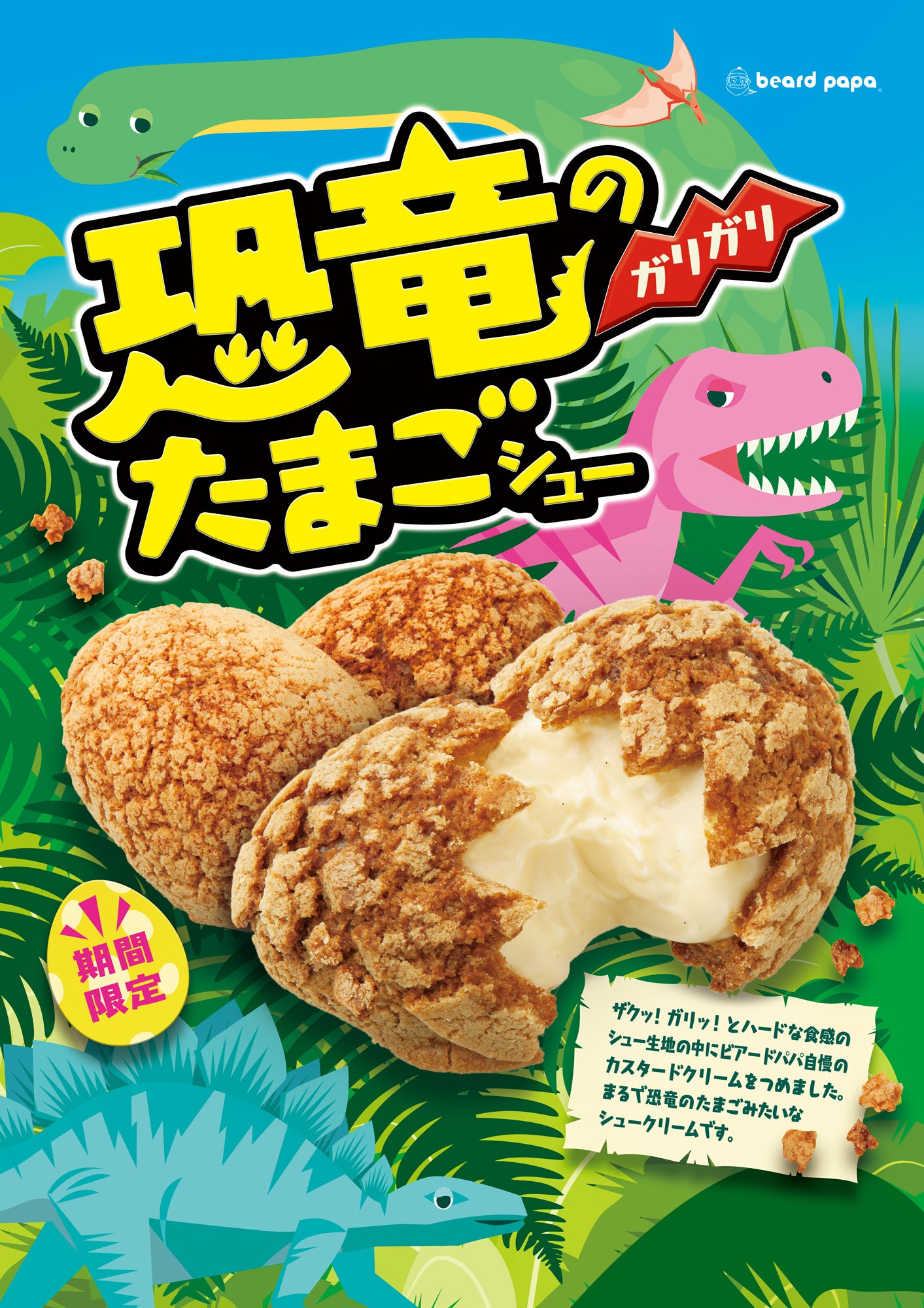 ザクッ!ガリッ!とハードな食感のシュー生地の中にビアードパパ自慢のカスタードクリームをつめました。まるで恐竜のたまごみたいなシュークリームです。