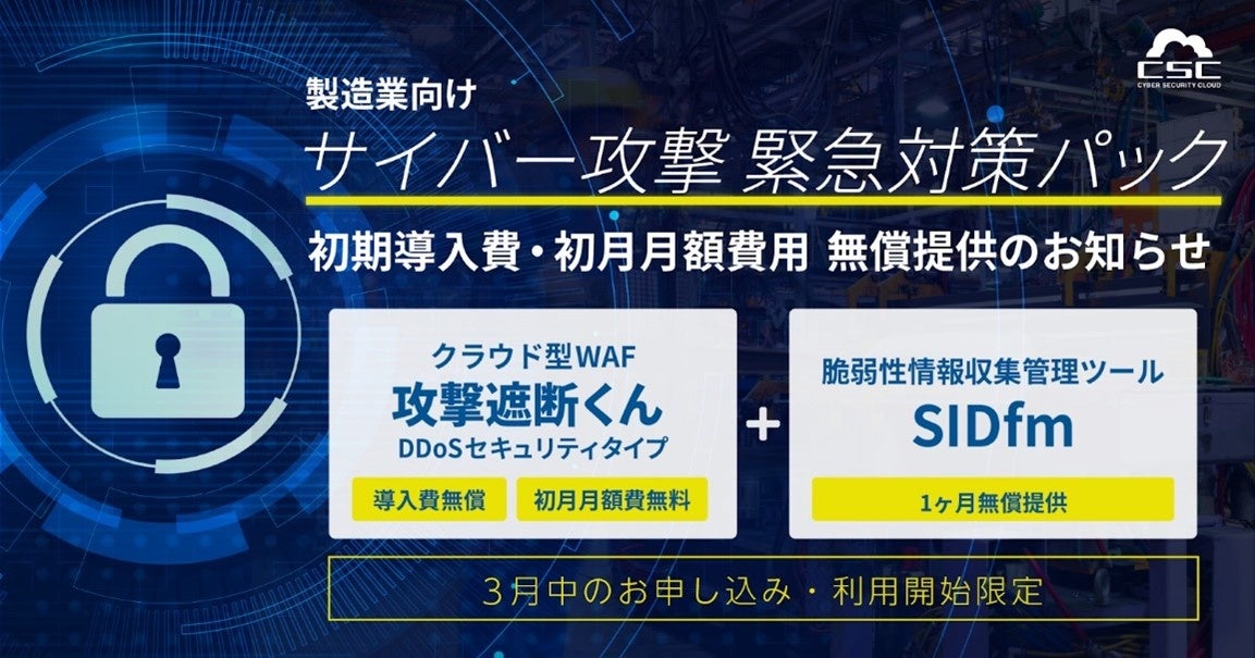 株式会社サイバーセキュリティクラウド(本社:東京都渋谷区、代表取締役社長 兼CEO 小池敏弘、以下「サイバーセキュリティクラウド」)は、世界規模で急増しているサイバー攻撃から日本の企業を守るべく『製造業向け サイバー攻撃緊急対策パック』を開発するとともに、初期導入費・初月月額費用を無償で提供するキャンペーンを実施します。