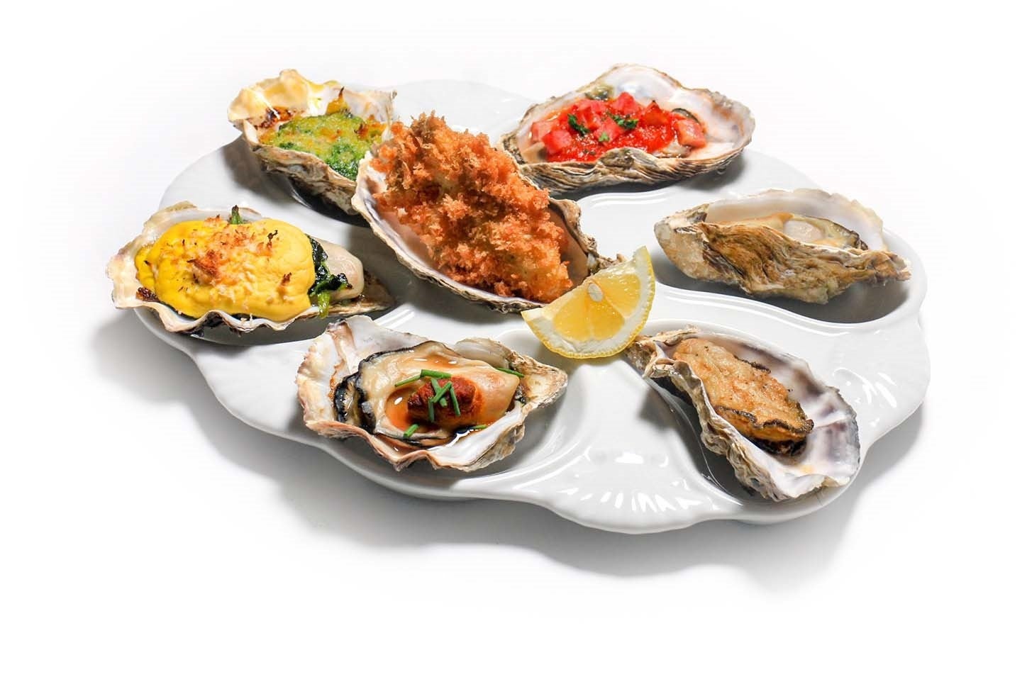 人気の焼き牡蠣が一度に楽しめる一皿。ブルギニョンバター、ベーコンとスモーキートマトソース、オランデーズソースとほうれん草、キノコとデミグラスソース、トリュフソースとパルメザンチーズ、ウニと牡蠣醤油の焼き牡蠣とカキフライ。
