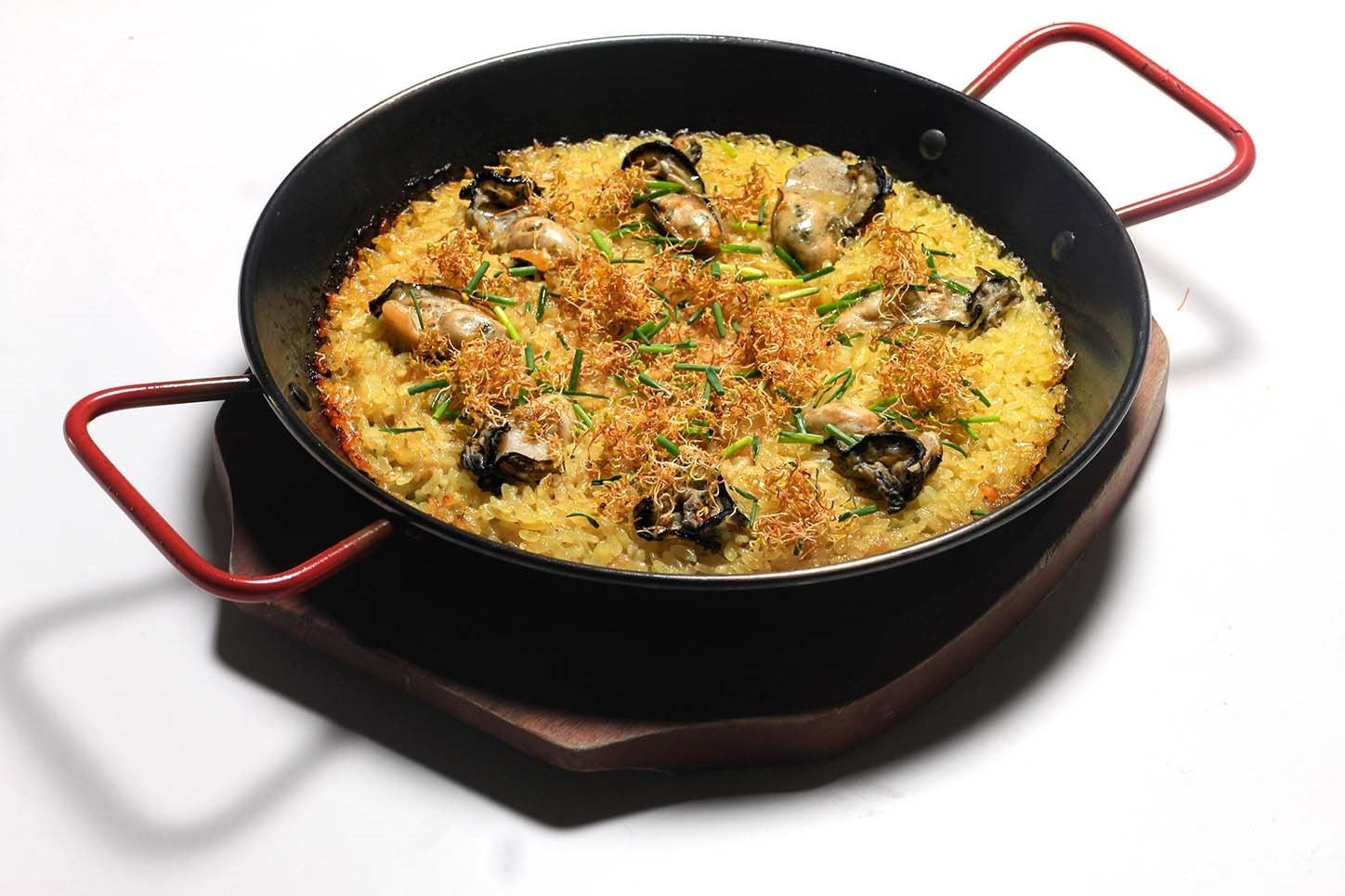 食後のサービスとして提供している牡蠣の旨味たっぷりの牡蠣スープで作った牡蠣専門店ならではのパエリア。牡蠣醤油で和風に仕上げました。