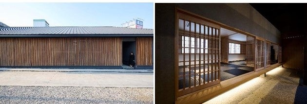 ジャパニーズモダンと和風の融合をコンセプトに、やわらかな木格子が印象的なファサードとし地域や利用者に寄り添います。数種類の上質な木材や石材などを使用した木造住宅です。内装は、素材を大切にし、くつろげる空間をデザイン、畳、上質な木材、木格子、石材、鉄などの素材の
