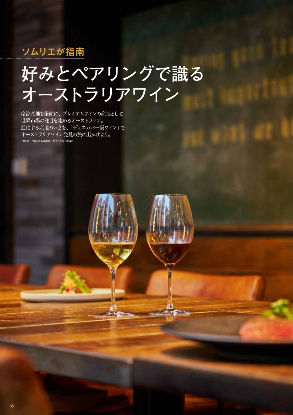 この春、ワインオーストラリアの主催で「ディスカバー豪ワイン」キャンペーンが全国53カ所の参加料飲店にて開催されます。誌面では、この参加店の中から4名のトップソムリエに登場いただき、設定されたテーマに基づき、各自が注目するオーストラリアワインをセレクトして紹介。オーストラリアワインの魅力、料理との相性、ペアリングのポイントなどを解説します。