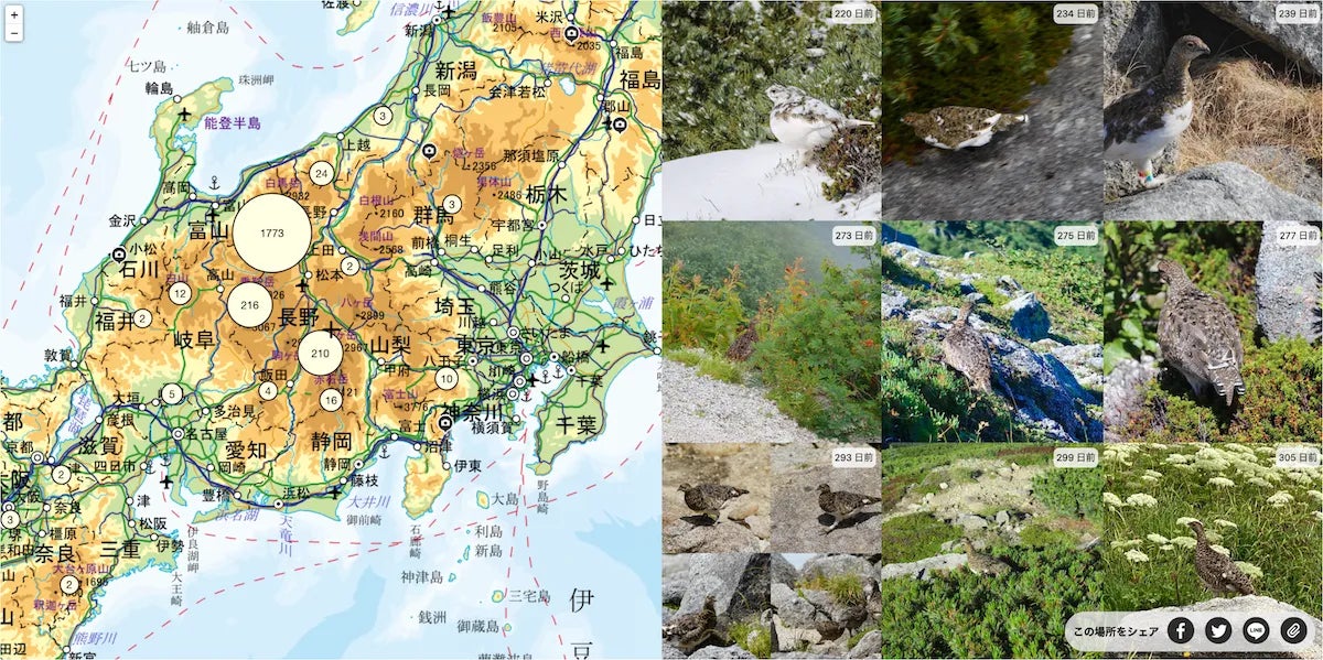 長野県は2020年から「ライチョウ保護スクラムプロジェクト」を展開し、2021年には目撃情報投稿アプリ「ライポス」の運用を開始。ヤマップは2022年6月に環境省と協定を締結し、登山者が投稿する写真のビッグデータを山岳生態系調査に活用する「みんなで守る山岳生態系プロジェクト」を始動し「ライチョウモニター」の運用を開始しました。