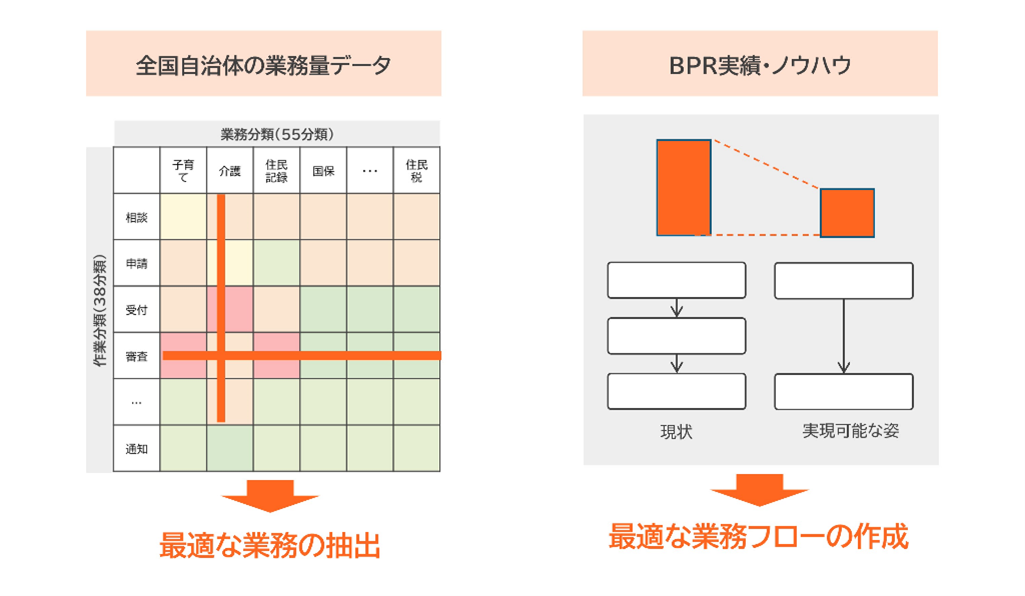 1.〔業務標準化モデル〕 ガバメイツが保有する「全庁業務量調査データ」から、業務分類(55種)×作業分類(38種)で類型化します。その中で標準化・共同化に適した業務(職員の業務負荷が高く、デジタル活用効果が高い業務)を抽出し、業務別に、最適な業務フローのモデルを作ります。さらに、最適な業務フローを実現するための各種ソリューション(システムやBPO)の最適な組み合わせをテンプレートとしてまとめます。これらを活用することで自治体は、業務時間の削減かつ費用対効果の高いシステムやBPOの導入が可能になります。