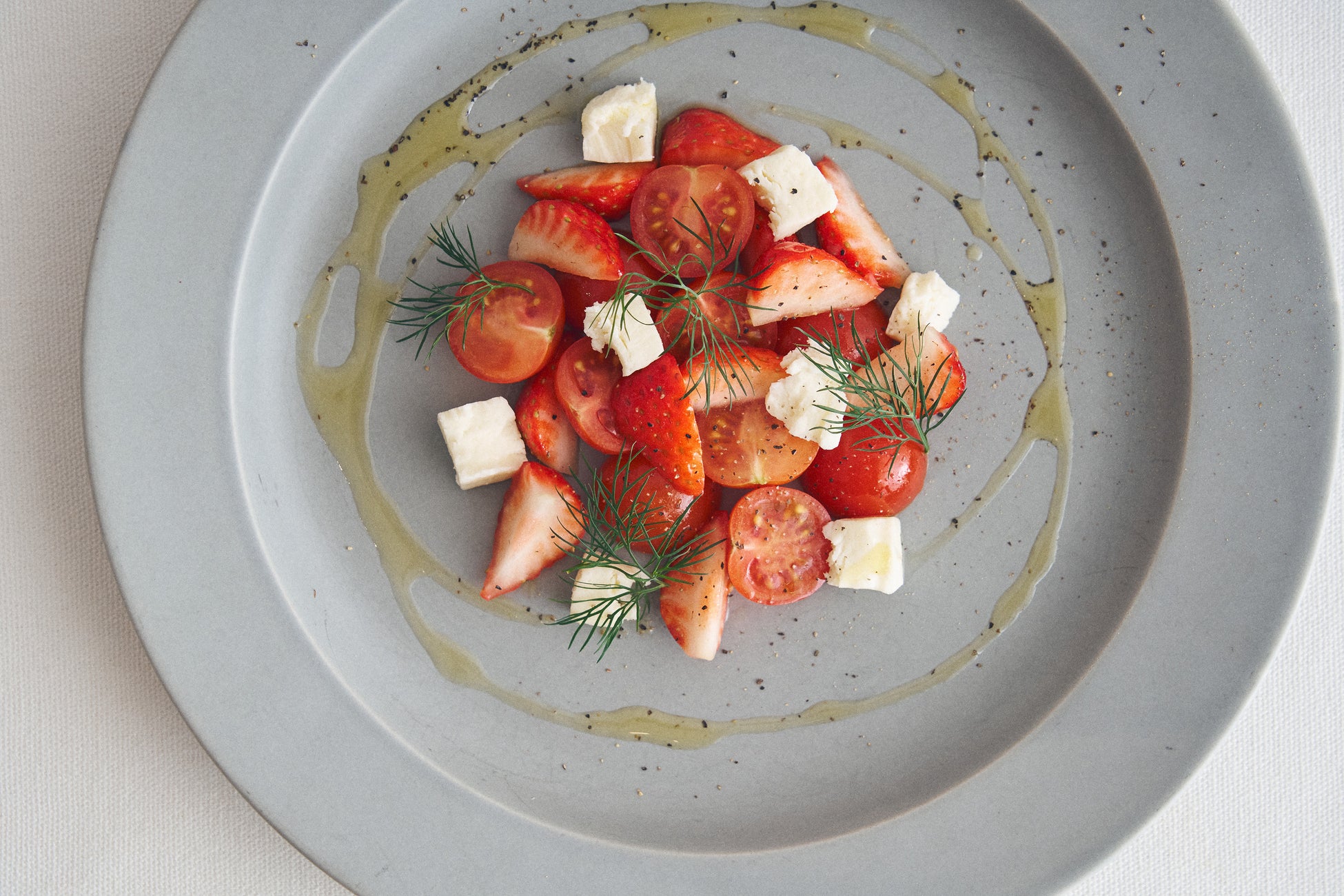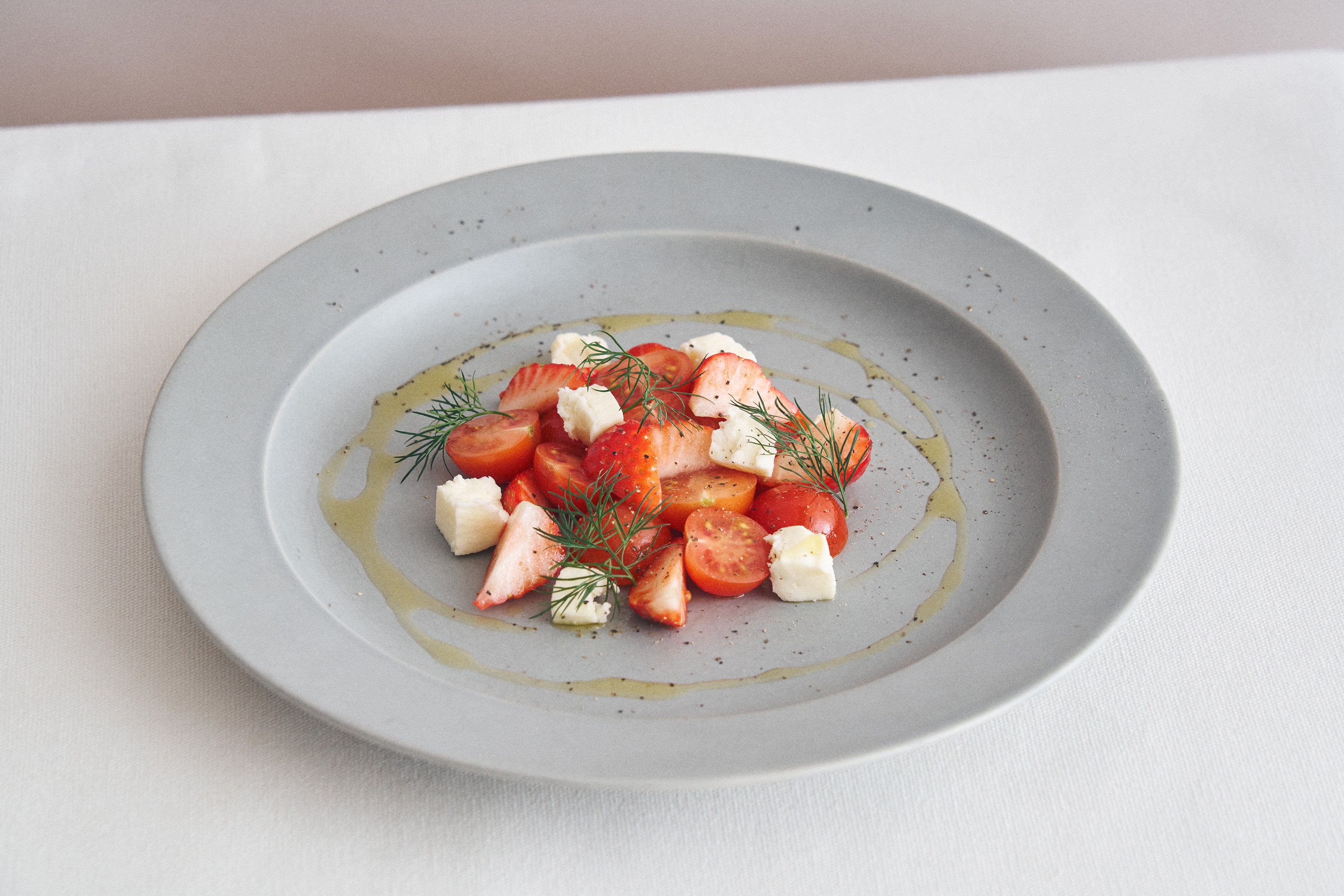 “あすかルビー”いちごの甘酸っぱさを活かすためにシンプルに塩とオイルで味付けをしたサラダです。酸味のあるミニトマトとの相性は抜群!その美しい彩りも一緒にお楽しみください。