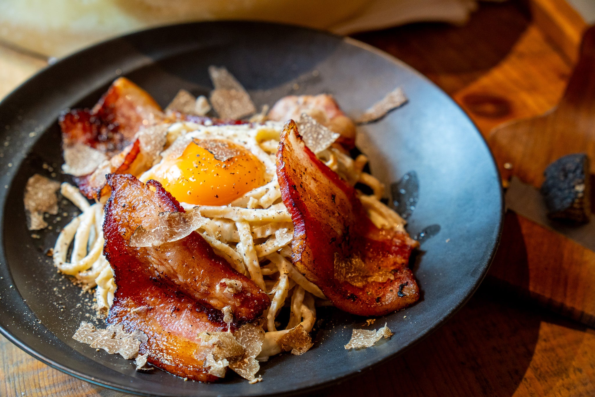 仕上げには、香り豊かなトリュフに削りかけることで、余韻まで贅沢な味わいに仕上げました。一口食べると、ベーコンの芳醇な香り、濃厚なチーズの旨味、トリュフの優雅な香りが広がります。
