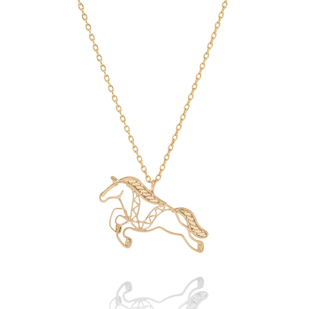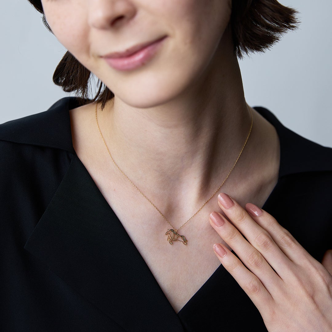 前傾姿勢で風を切る躍動感を、繊細な金線細工で表現した大地を走る馬の姿が、胸元に凛とした輝きを添えます。