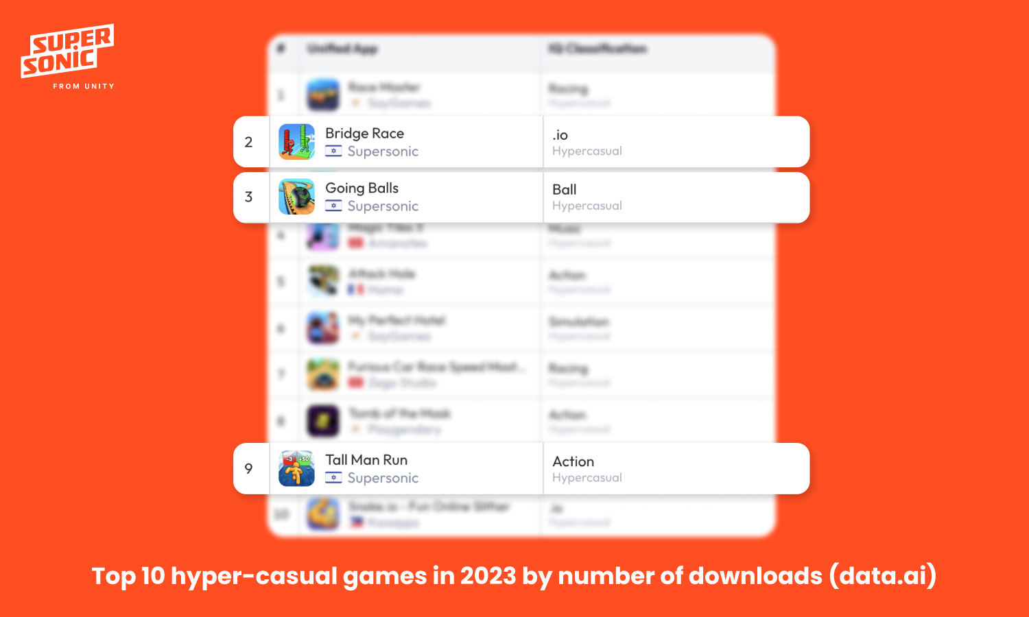 2023年に世界で最もダウンロードされたハイパーカジュアルゲームのトップ10において、Supersonic from UnityのゲームであるBridge Raceが2位、Going Ballsが3位、Tall Man Runが9位にランクインしました(出典: data.ai)