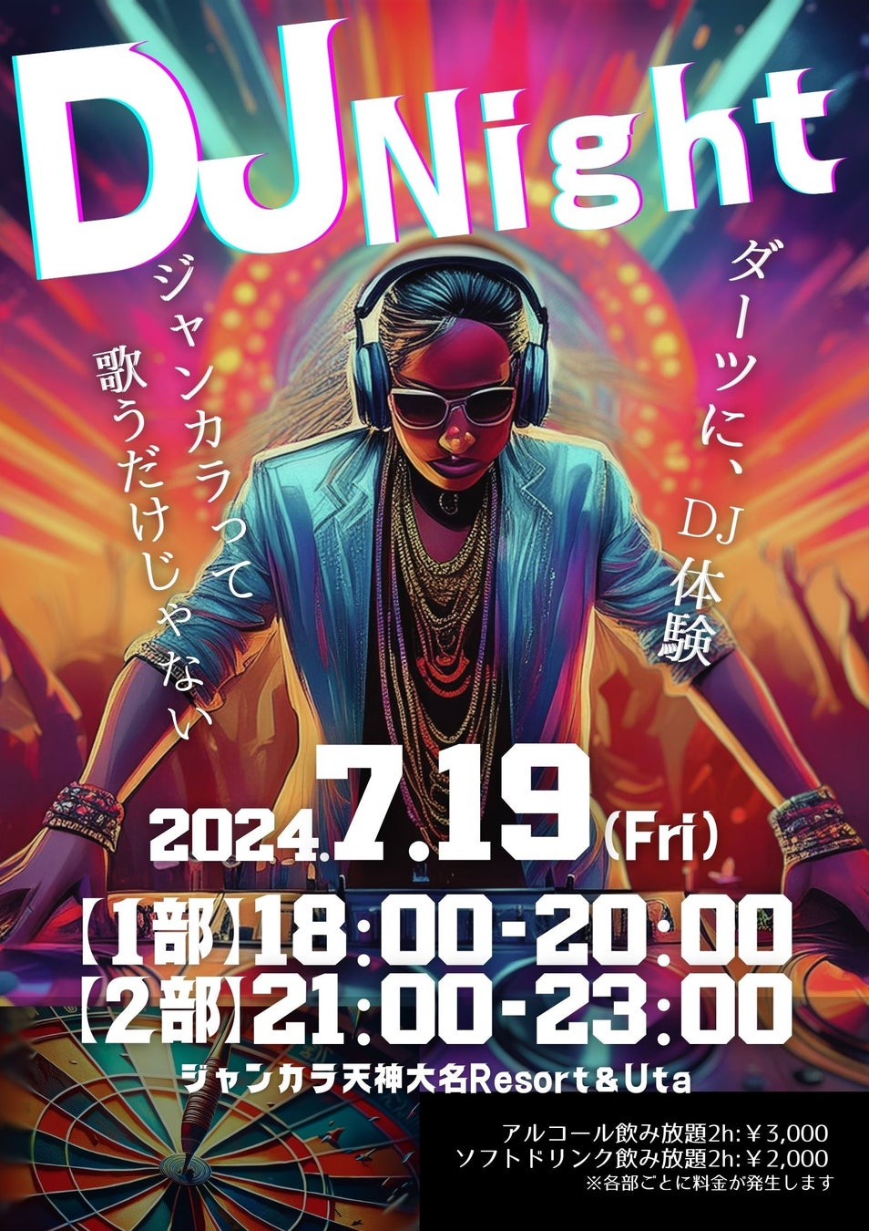 内容:DJパフォーマンス、DJ体験、飲み放題、フライドポテト食べ放題 ※イベント時間中はカラオケ不可