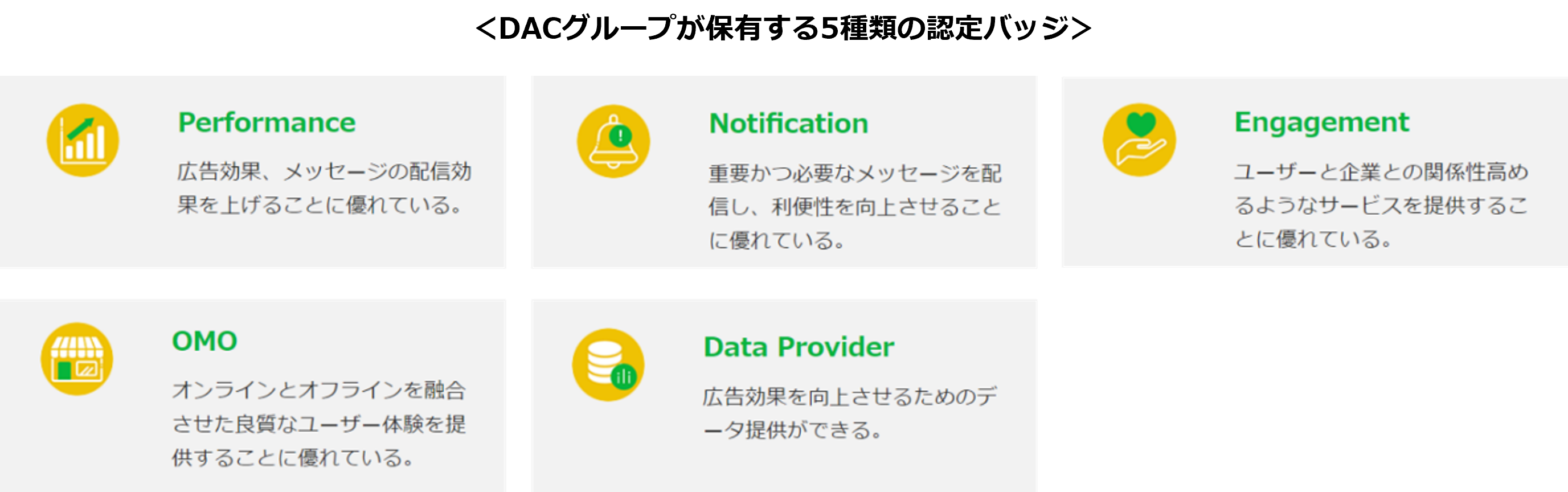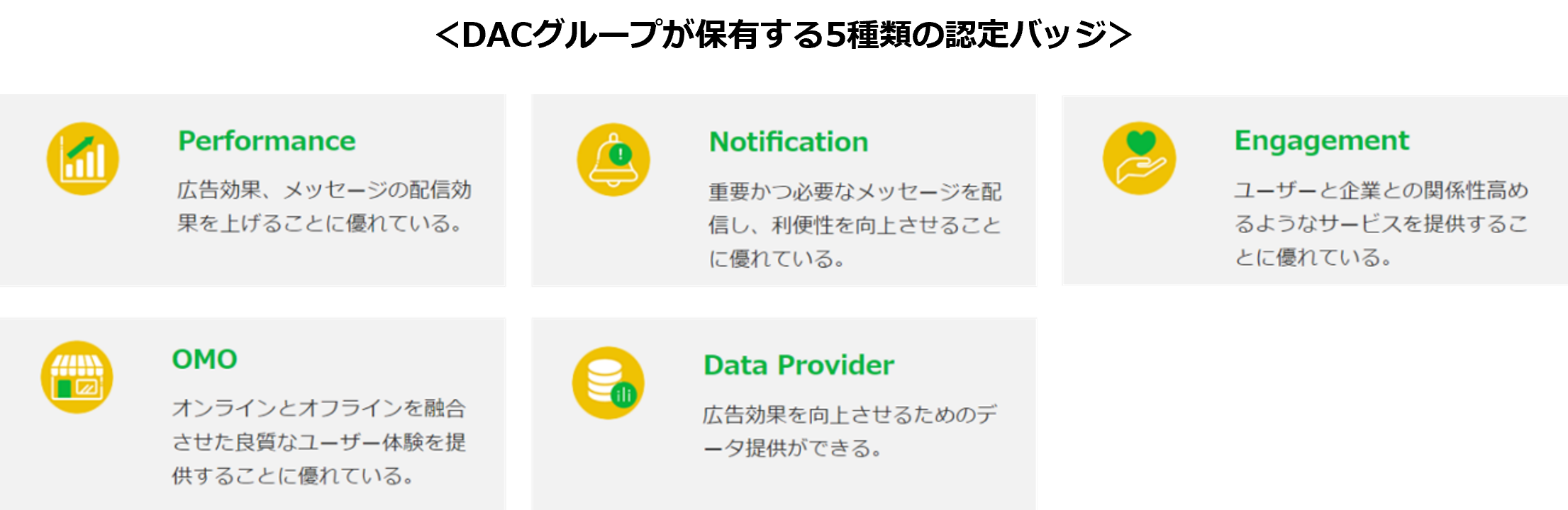 (※2)2022年4月5日リリース 『DAC、「LINE Biz Partner Program」の「Technology Partner」において、 認定バッジ「OMO」「Notification」を取得 ~「Data Provider」を含め1社では最多の3つ、グループでは最多の4種類を獲得~』