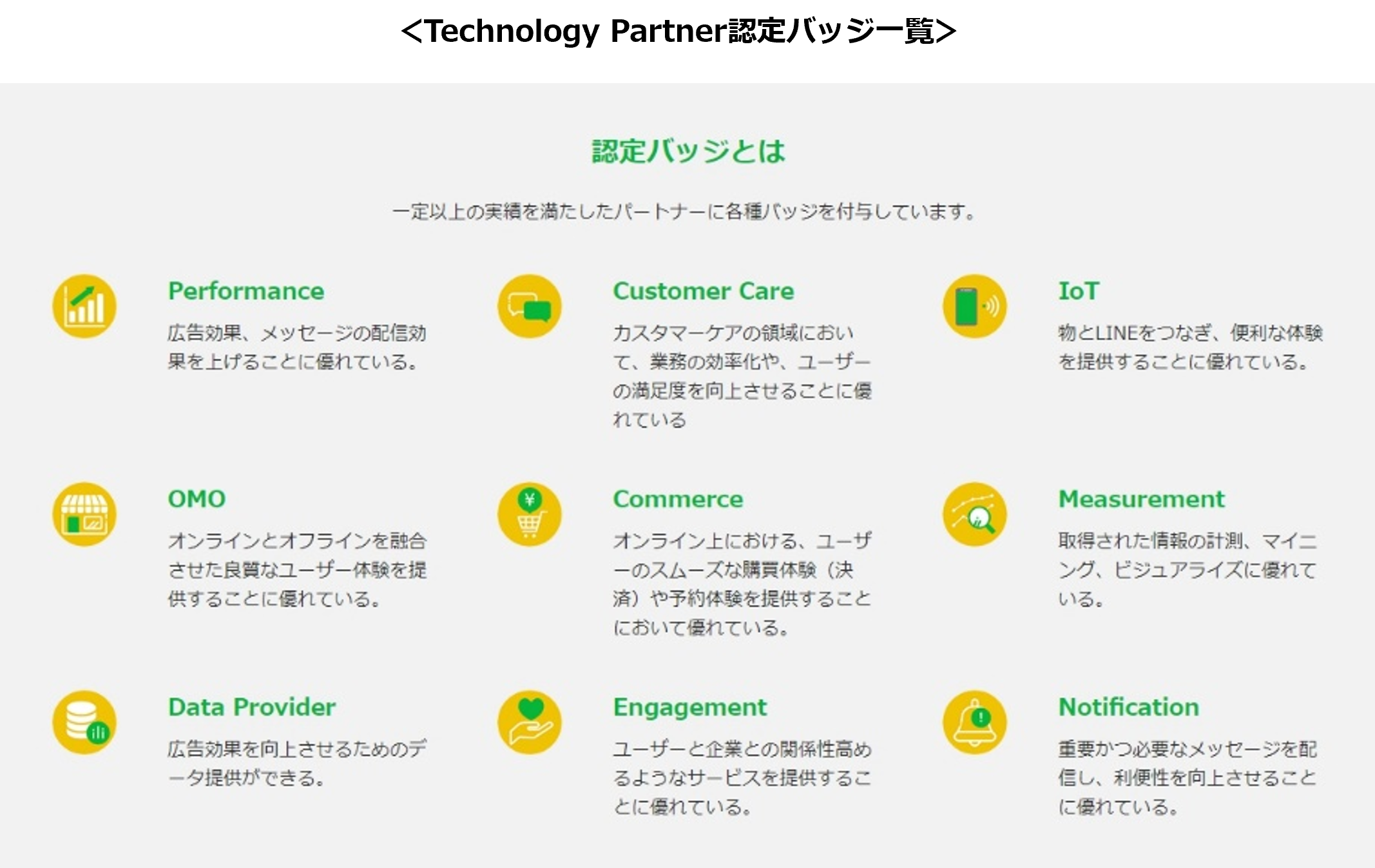 要望に応じてLINEと連携するツールの仕様共有が可能であるか、LINEの仕様変更時に対応するスキル・リソースがあるか、要求される技術仕様を保つことができるかなどを基準に認定されます。一定以上の実績を満たしたパートナーには、各種認定バッジが付与されます。