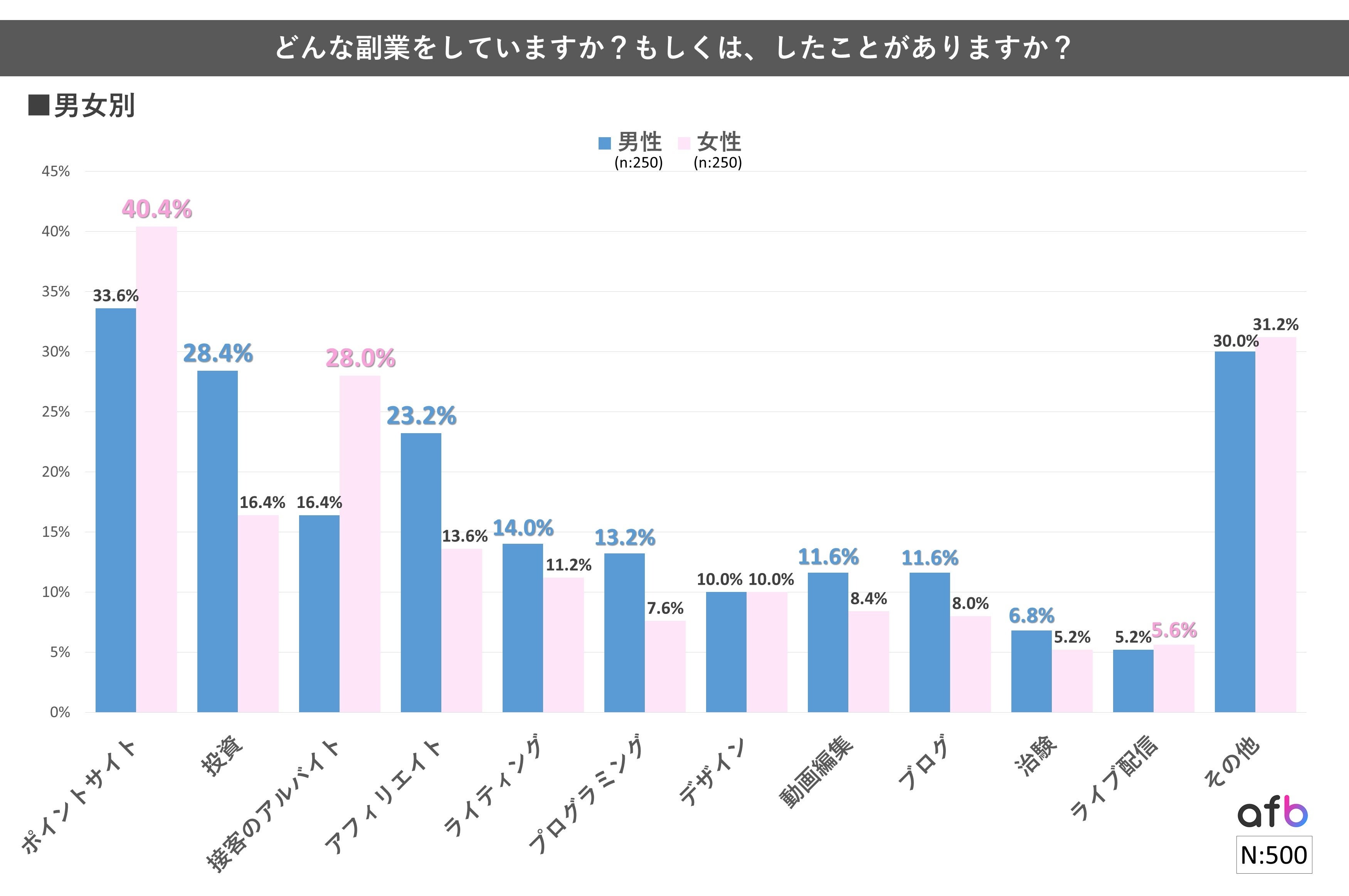 パフォーマンステクノロジーネットワーク「afb(アフィビー)」< https://www.afi-b.com/ >の開発運用をおこなう株式会社フォーイットは、全国の10代~60代までの男女500人を対象に副業に関するアンケートを実施し、男女別・世帯年収別等の特徴についてまとめました。
