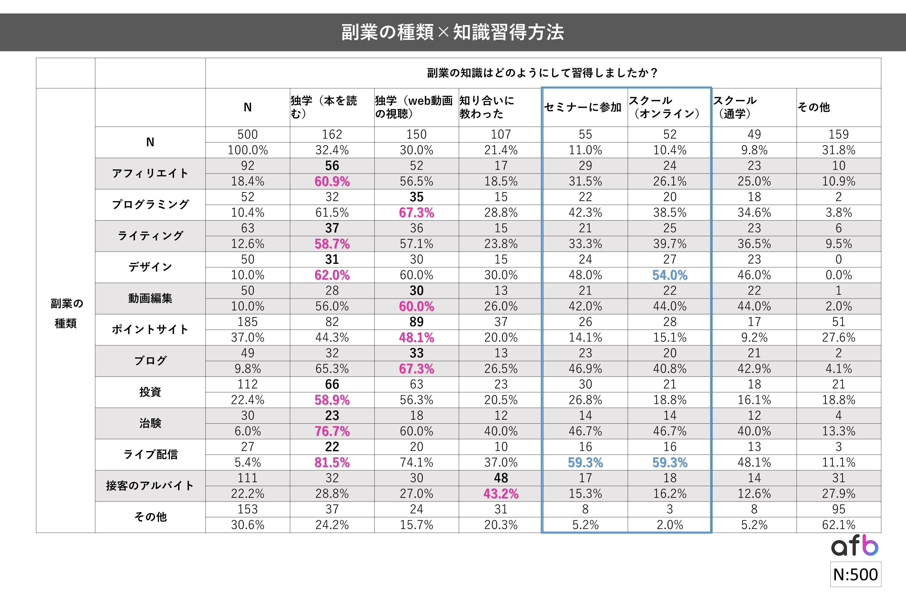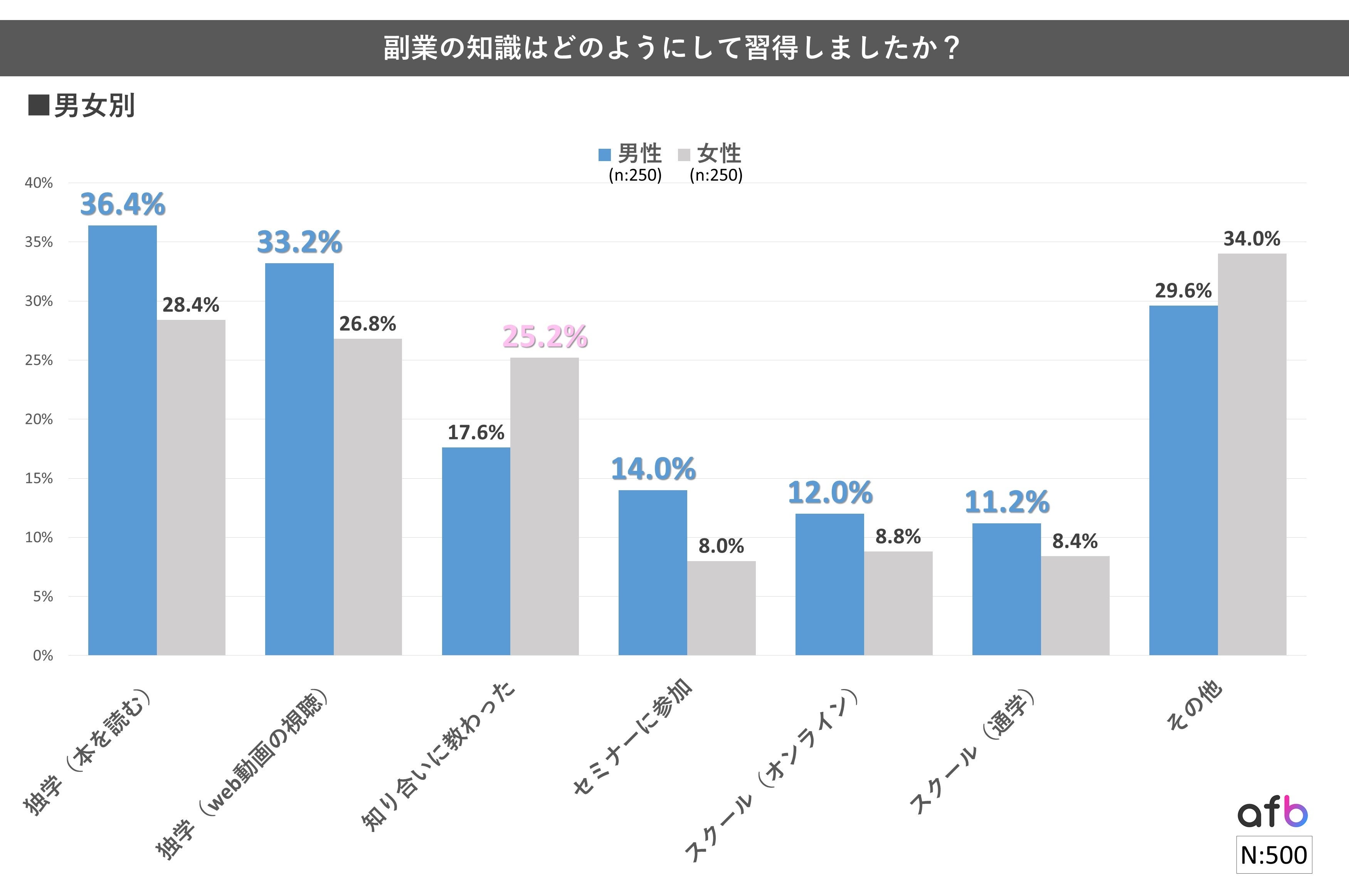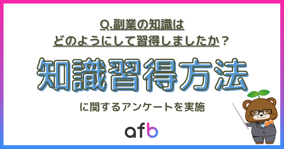 以前実施した「副業をしたことはありますか?」https://www.afi-b.com/beginner/archives/tsushin/13645/というアンケートでは、「ある」と回答した方は男性:20.4%、女性:19.0%と、副業の”実施率”に男女で大きな差はないという結果になりましたが、副業に取り組む副業”目的”や”種類”には違いがあったため、知識の習得方法にも差が出る結果となりました。