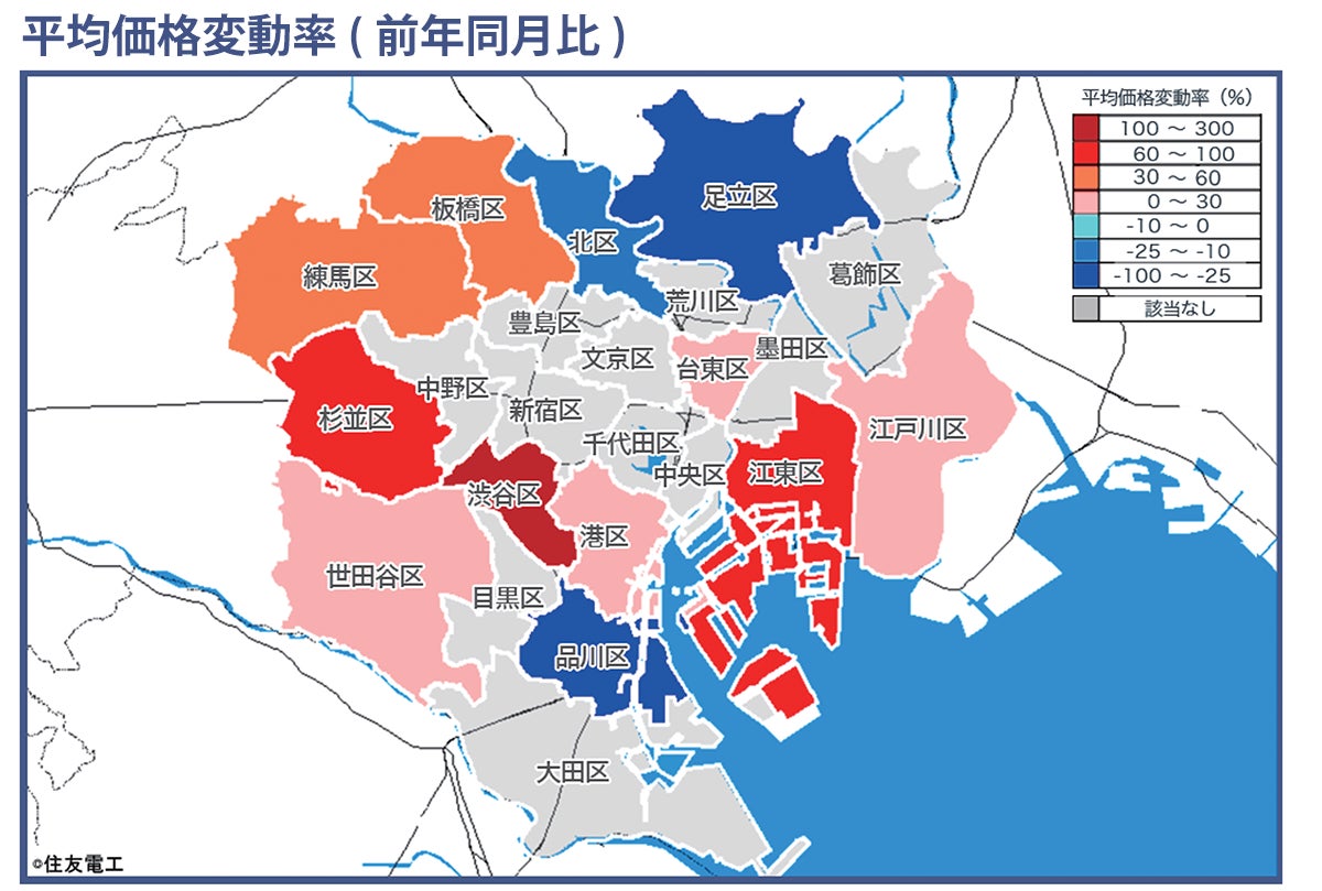 地図の各行政区ごとの色の違いは、同行政区における平均価格の前年同月比(平均価格変動率)の程度を表しています。